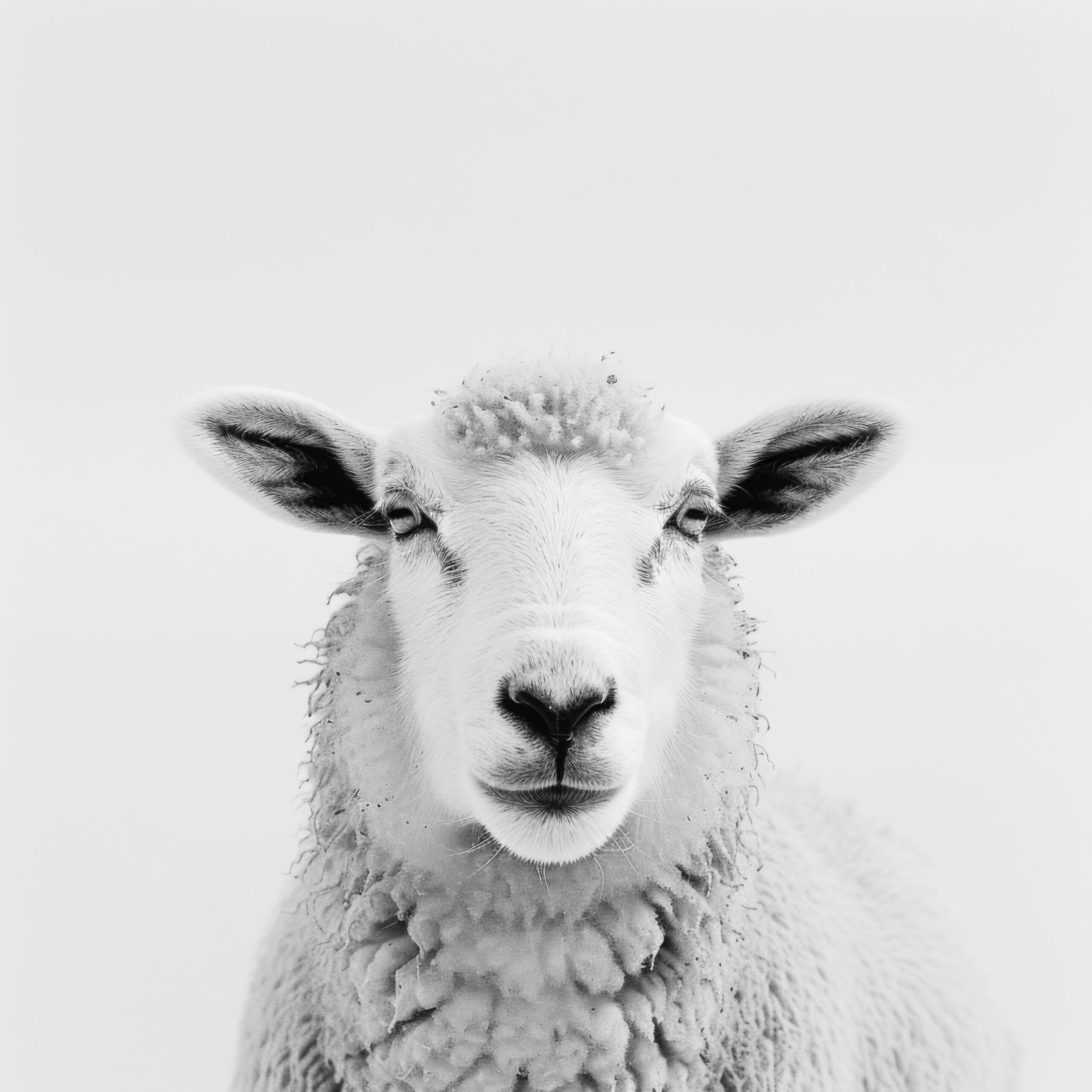 Ein zentrales Motiv von ruhiger Präsenz. Das Schaf scheint im leichten Gegenlicht zu stehen, fast verschwimmend am Rand. Die monochrome Darstellung verstärkt den Fokus auf Form und Textur, fast minimalistisch.