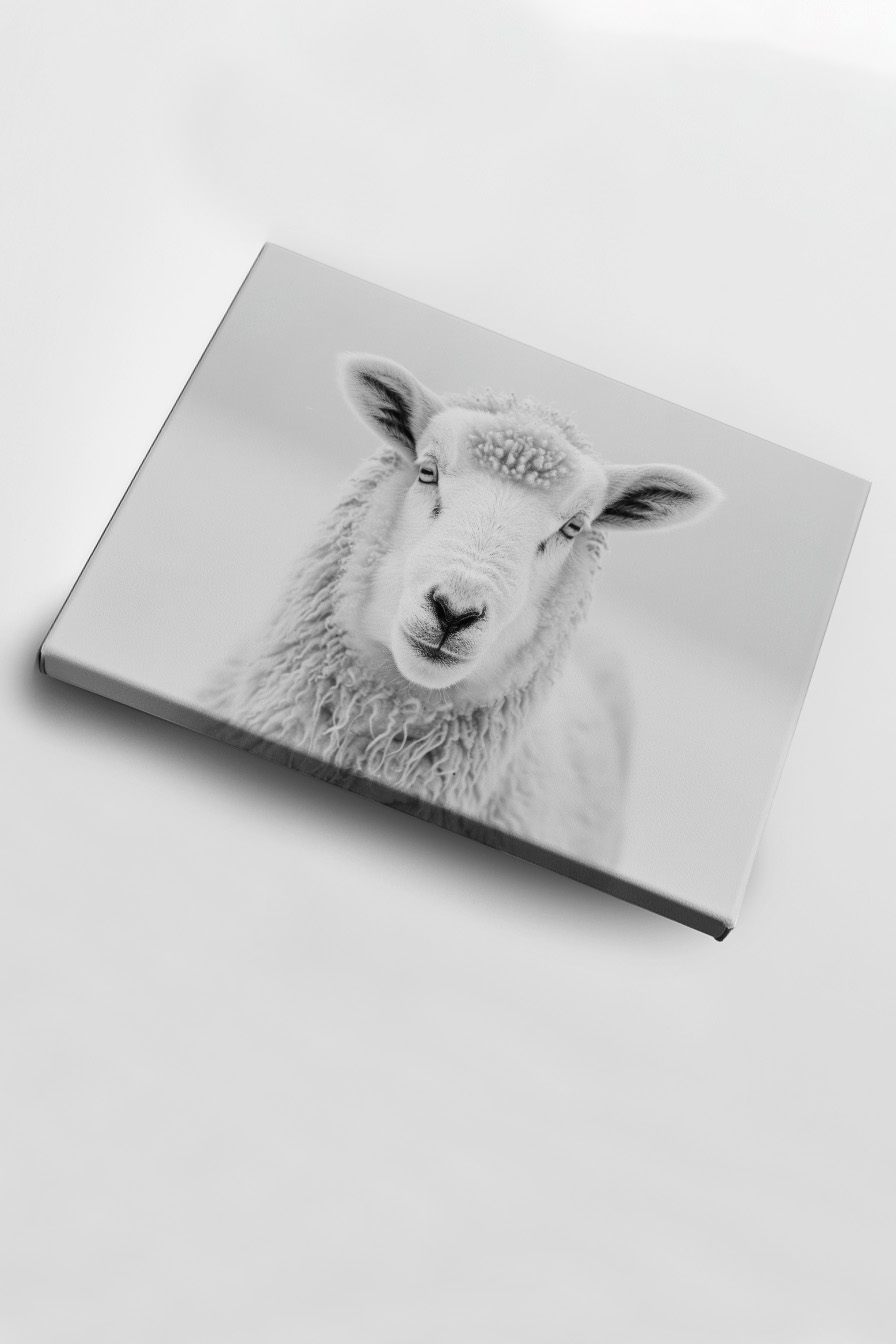 Das Gesicht des Schafs dominiert mittig, reduziert auf Formen und Texturen. Die fast weiße Umgebung hebt das Motiv hervor, eine ruhige Komposition ohne Ablenkung. Die Struktur des Fells wirkt lebendig und spürbar.