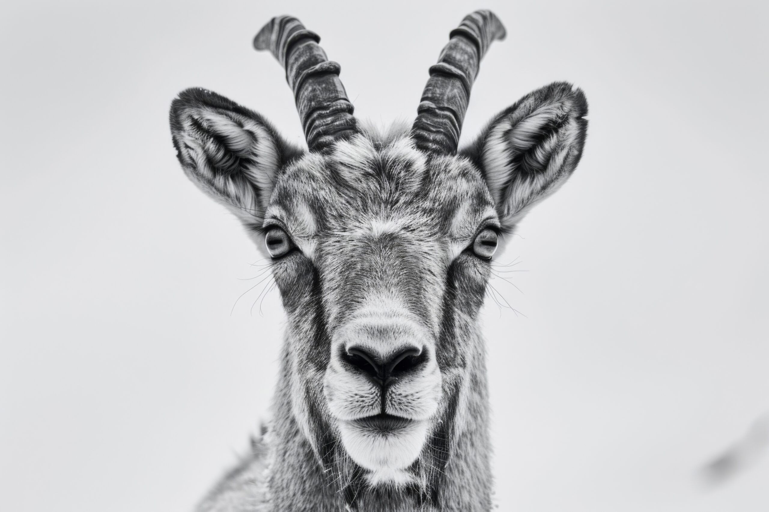 Das Porträt zeigt den Steinbock im Mittelpunkt, seine Präsenz füllt den Raum. Die deutlichen Kontraste der schwarz-weißen Darstellung vermitteln eine konzentrierte Stimmung. Feine Strukturen im Fell ziehen die Aufmerksamkeit immer wieder an.