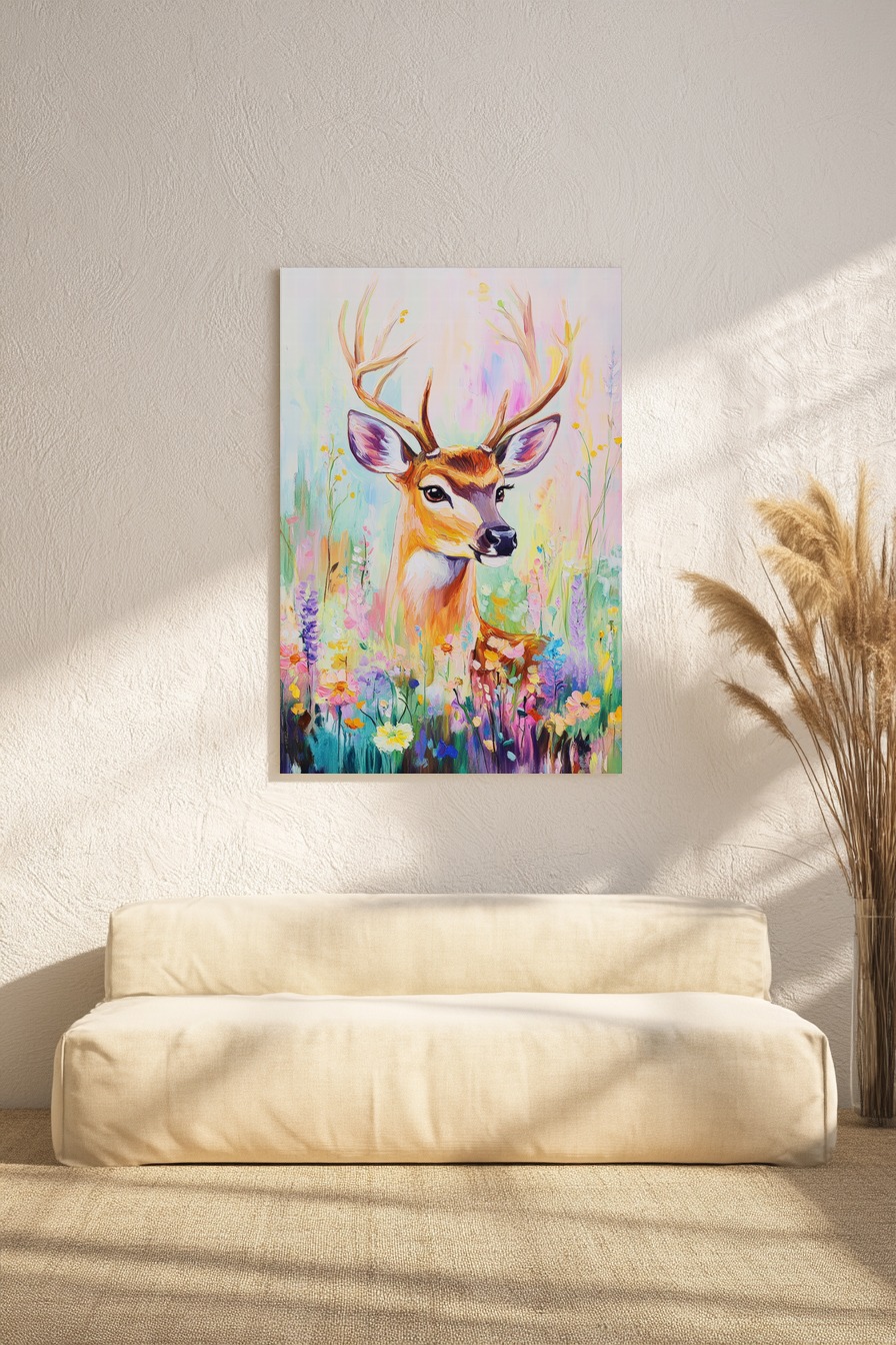 Ein farbenfrohes Bild eines Hirschkopfes umgeben von vielfältigen Blumen. Die lebhafte Malweise verleiht dem Motiv einen frischen, natürlichen Charme.
