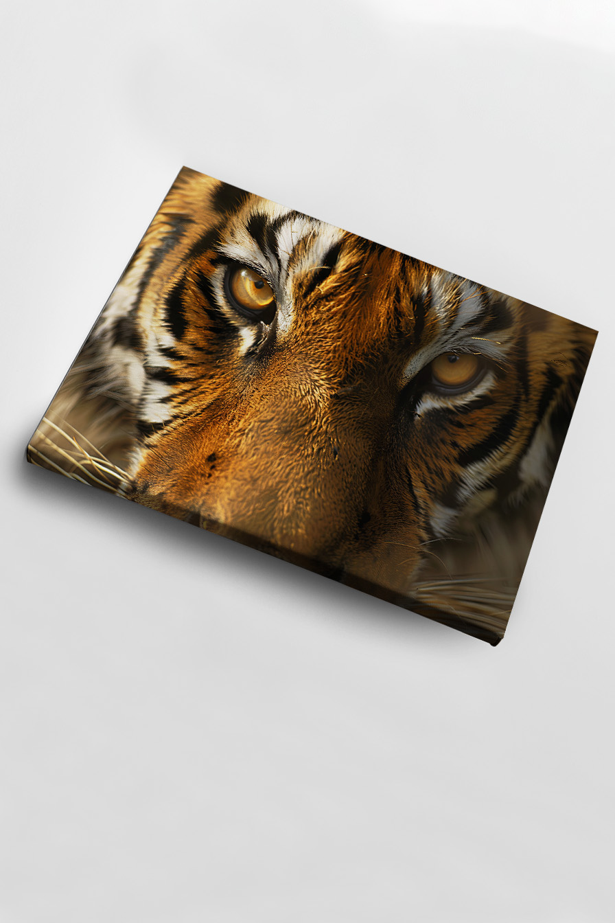 Der kraftvolle Blick und die feinen Fellstrukturen erzeugen eine dichte Atmosphäre voller Energie und Spannung, die sich im Raum entfaltet.