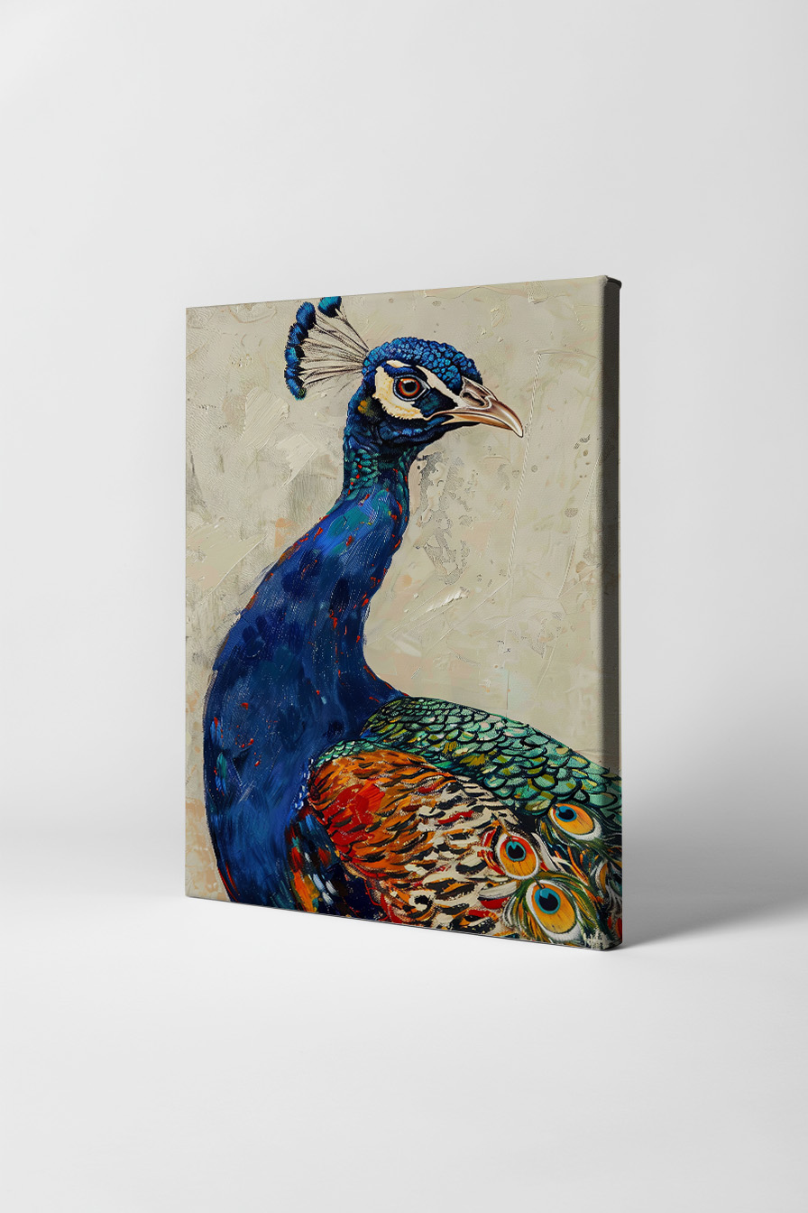Das Zusammenspiel der kräftigen Farbflächen mit den detaillierten Federmustern wirkt fast plastisch. Besonders die schillernden Augenflecken der Schwanzfedern präsentieren sich klar und lebendig. Die filigrane Krone auf dem Kopf gibt dem Bild eine besondere Note.