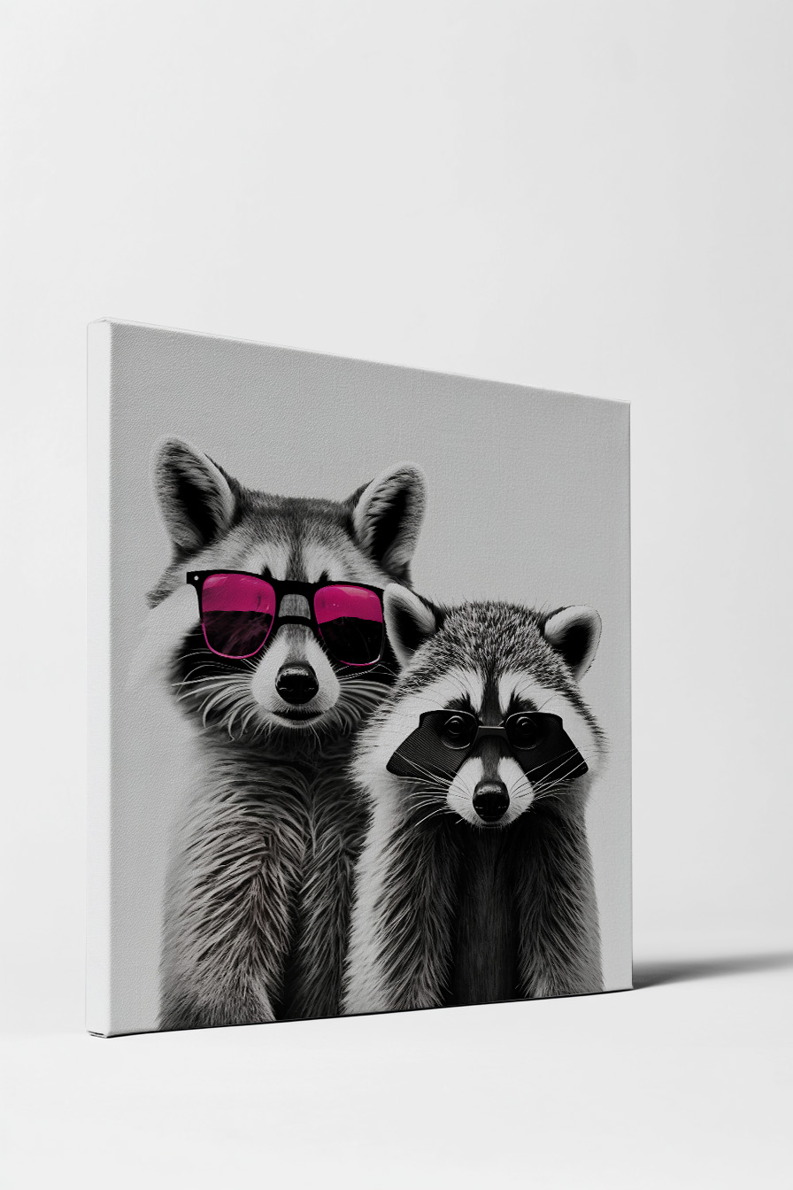 Druck von zwei Waschbären mit Sonnenbrillen auf Baumwoll-Polyester-Leinwand (300-350 g/m²) gespannt auf FSC-Kiefernholzrahmen. Inklusive Aufhängeset.