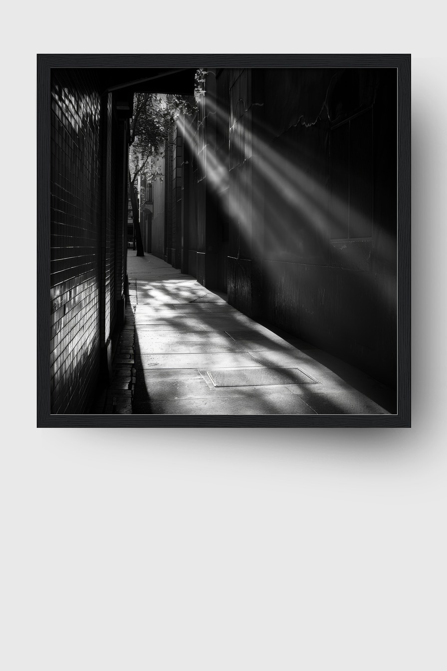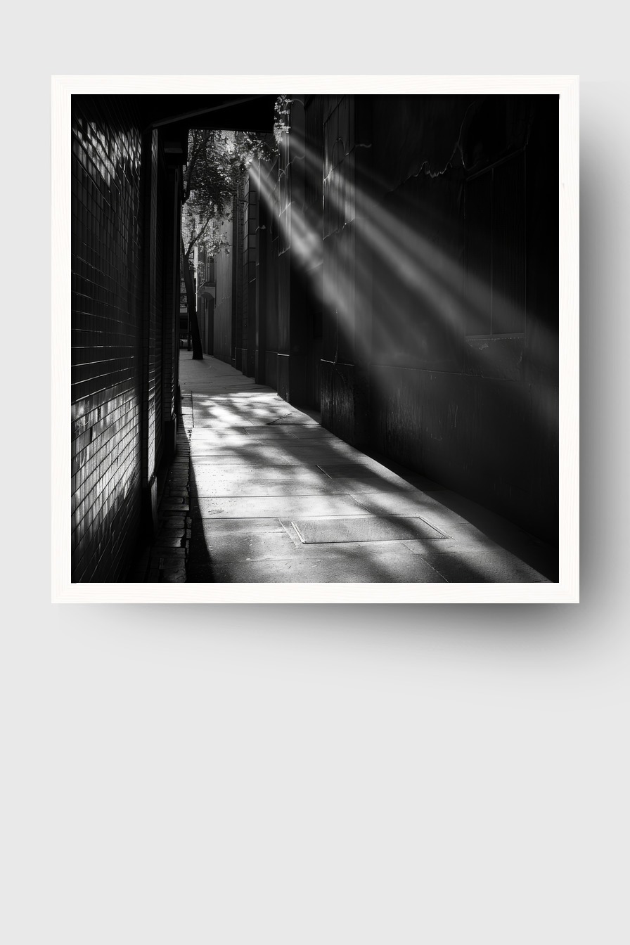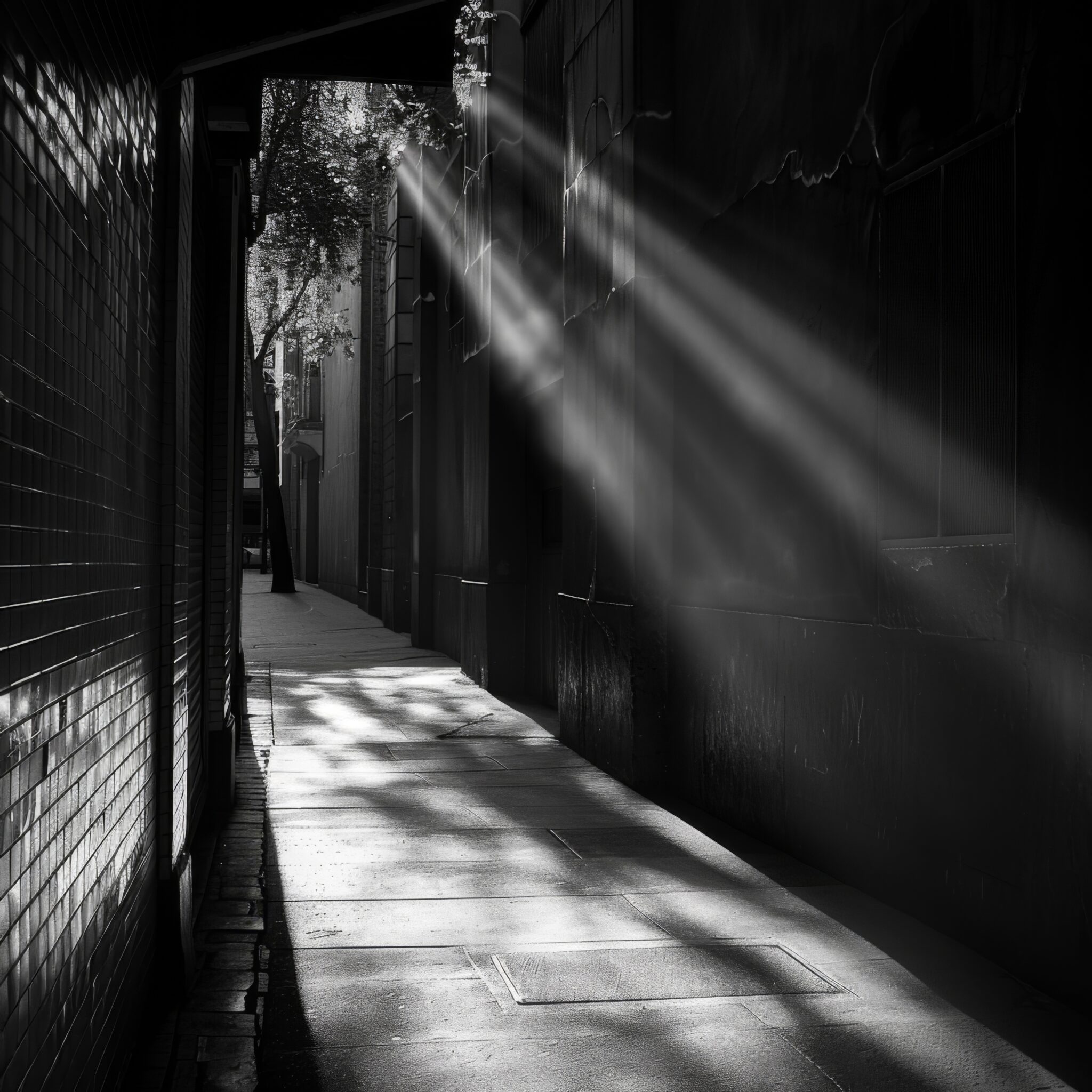 Licht bricht durch die Gasse, lässt Formen tanzen und definiert den Raum mit scharfem Kontrast.