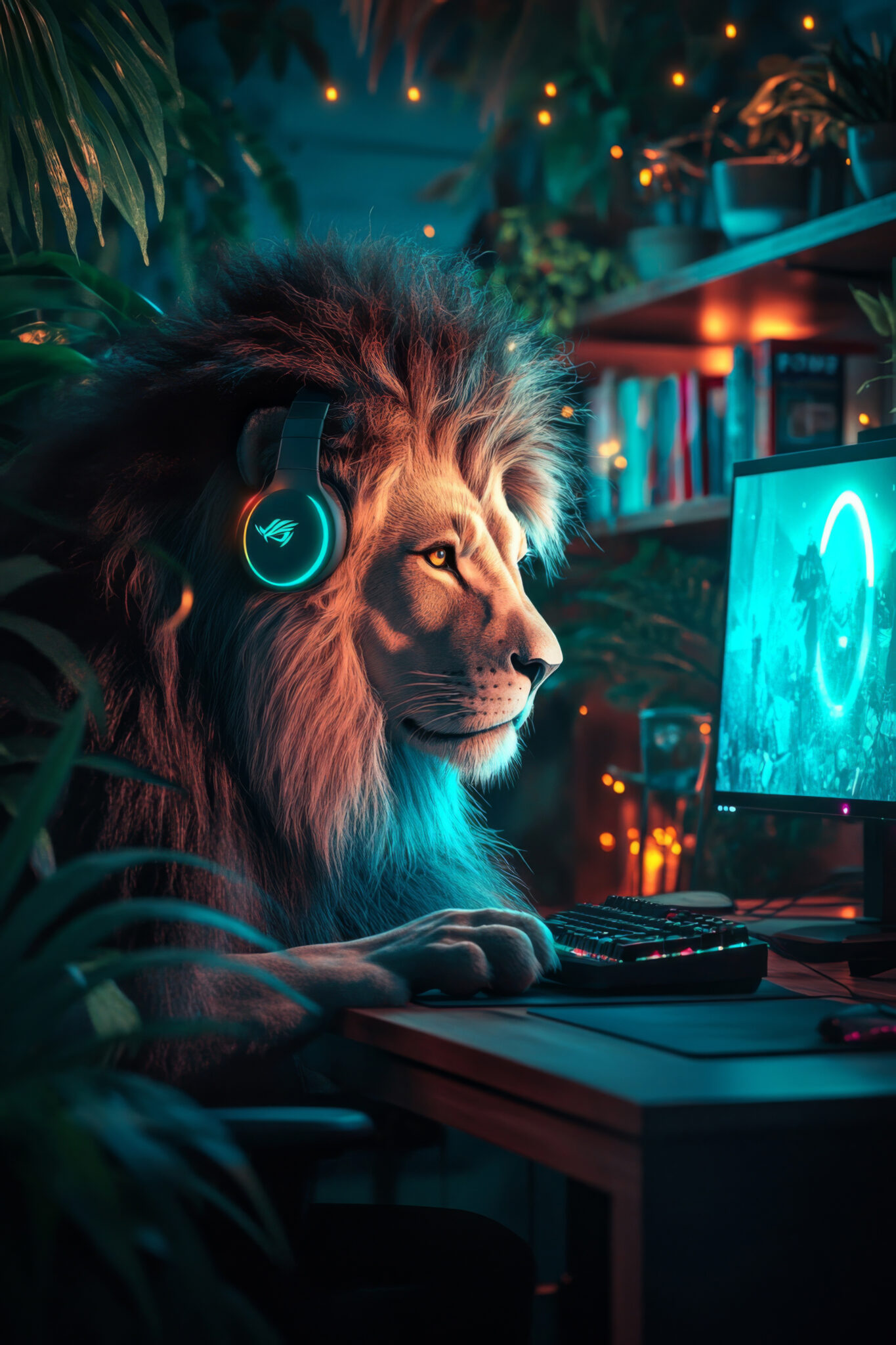 Der Löwe hebt das Pfoten auf der Tastatur an. Die Szene wirkt ruhig und technisch durch die Umgebung mit Computer und Lichtakzenten.
