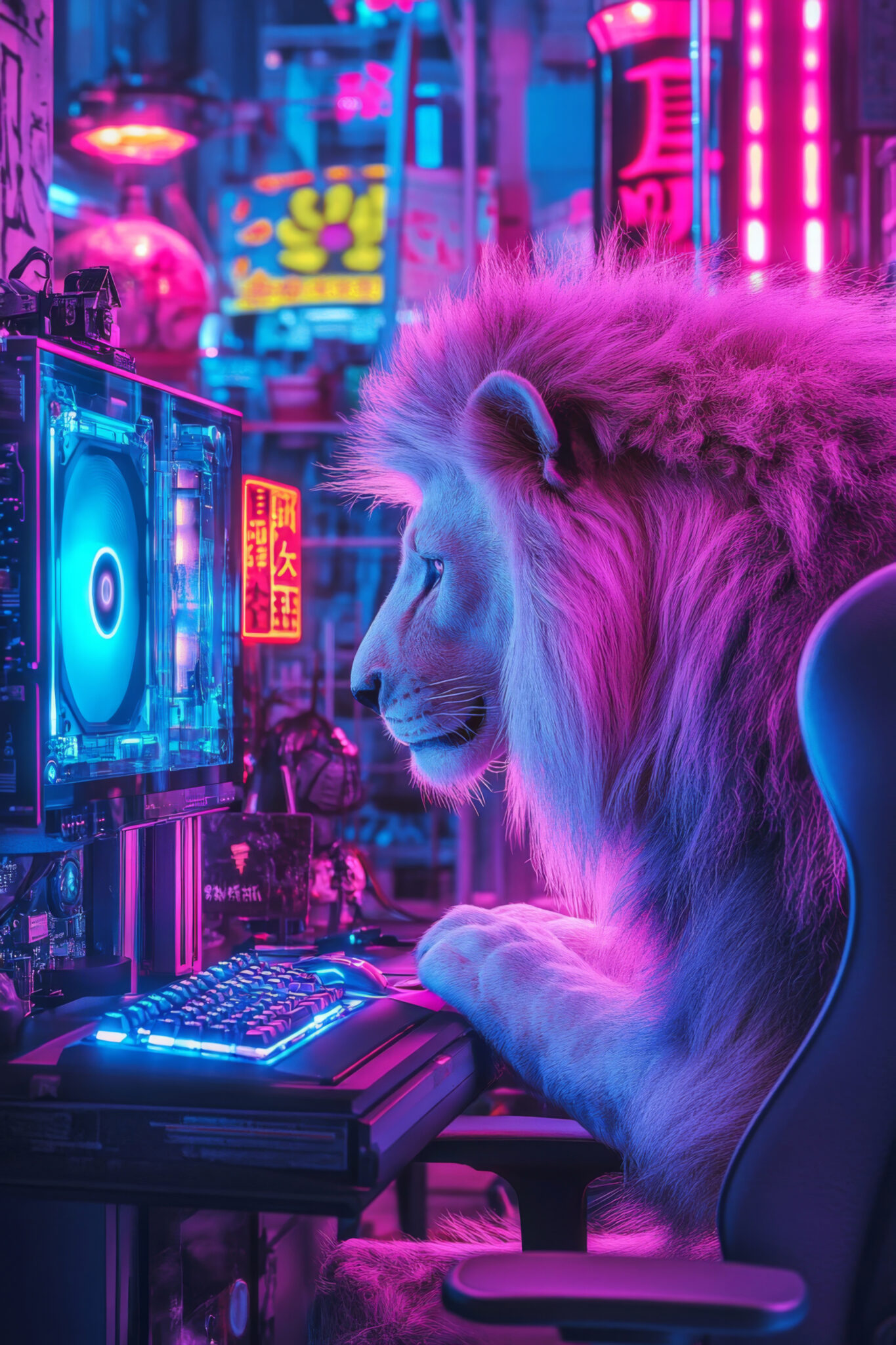 Das kraftvolle Tier ist umgeben von lebhaften Lichtreflexen, die in einer lebendigen urbanen Szenerie zu schweben scheinen. Das Bild vereint das Natürliche mit technoiden Elementen und lädt dazu ein, die Details seiner Ausstrahlung und Umgebung zu entdecken.