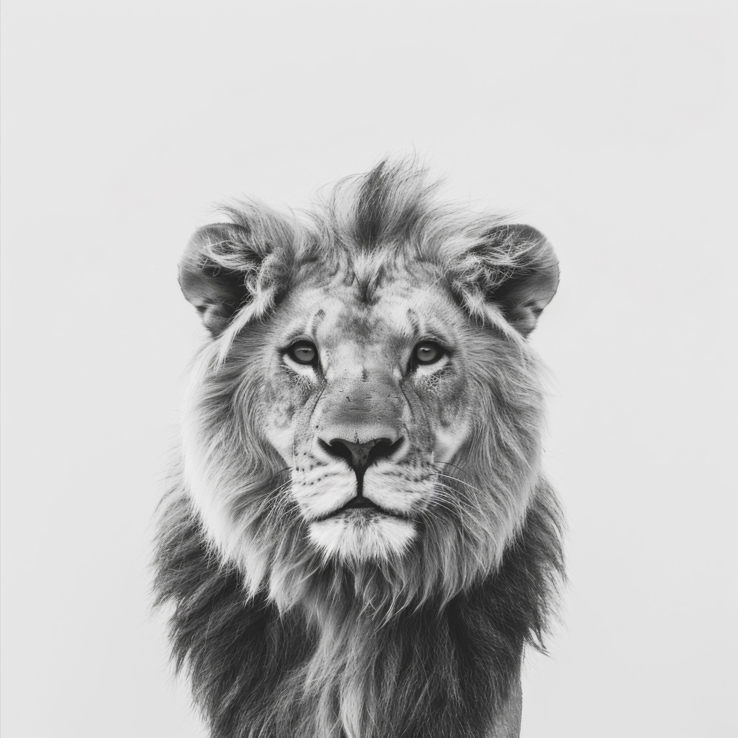 Das Bild strahlt Ruhe und Kraft aus, eine monumentale Darstellung des jungen Löwen im monochromen Stil.