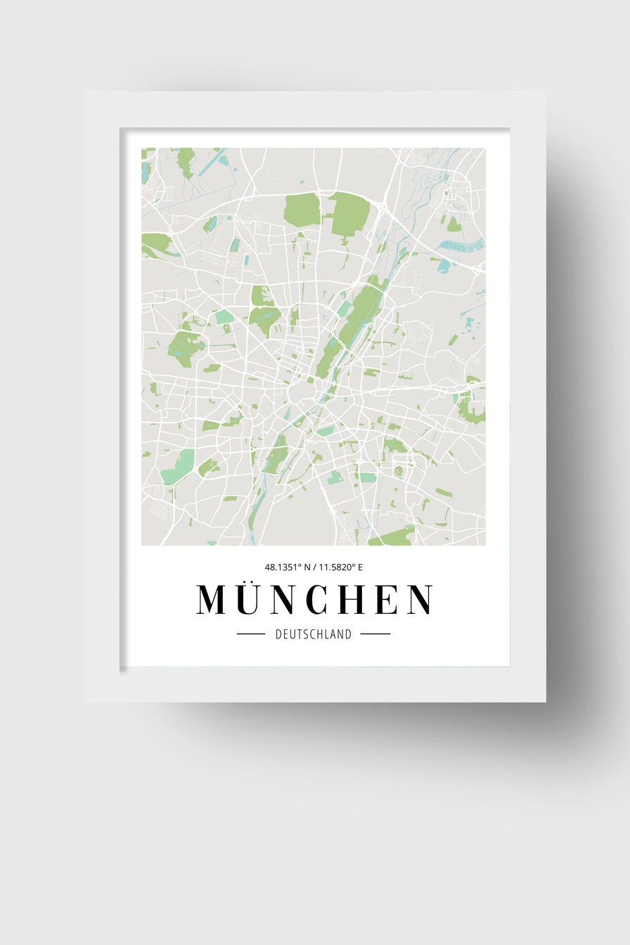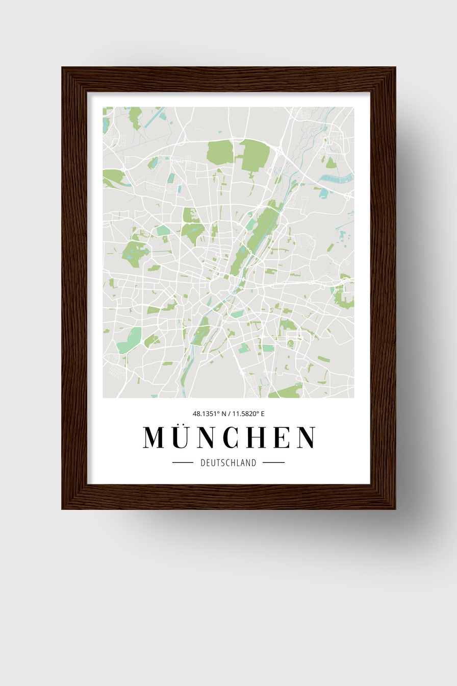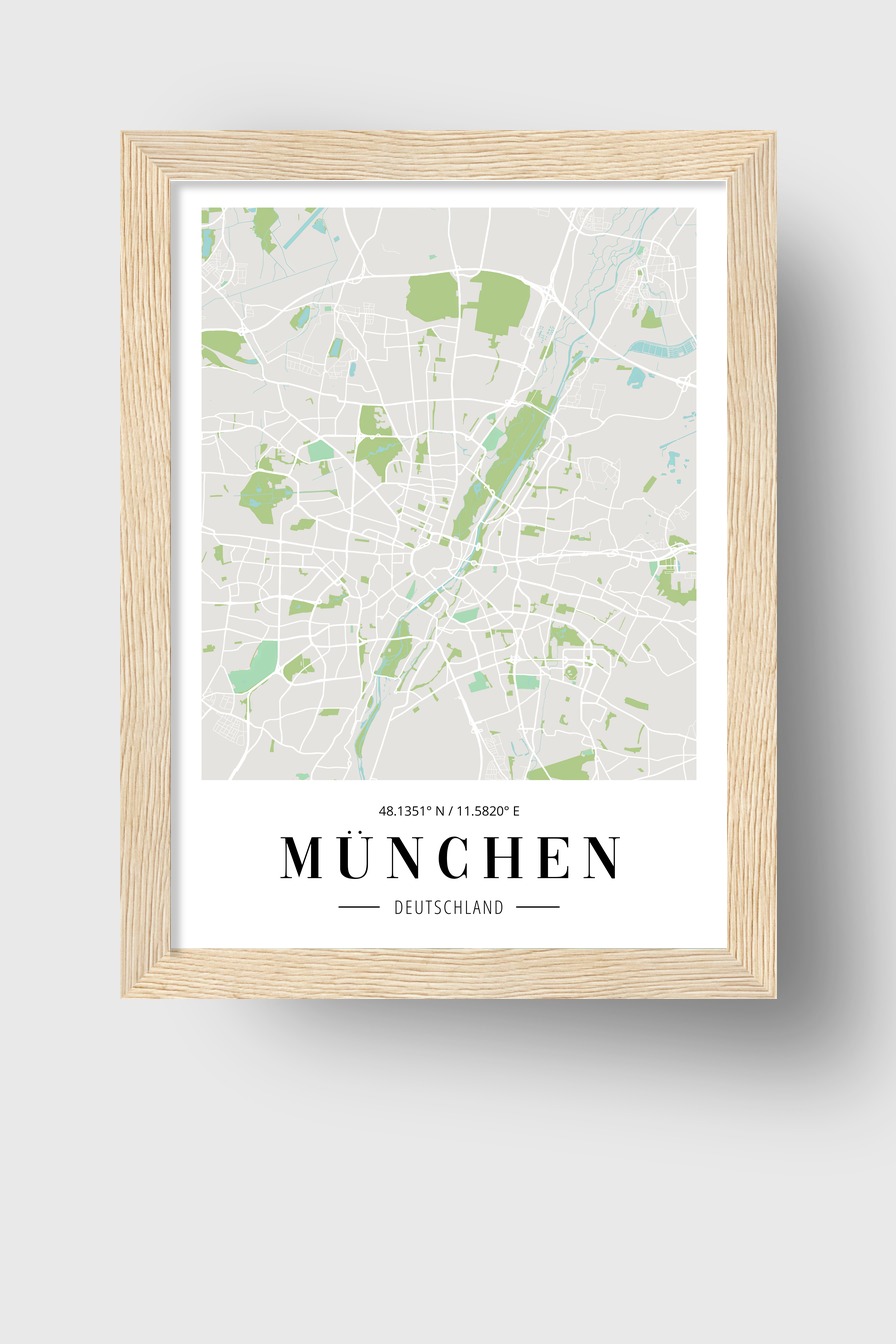Der strukturierte Stadtplan setzt Akzente an der Wand und lenkt den Blick auf das kompakte Zentrum Münchens. Ideal für Räume mit urbaner Atmosphäre.