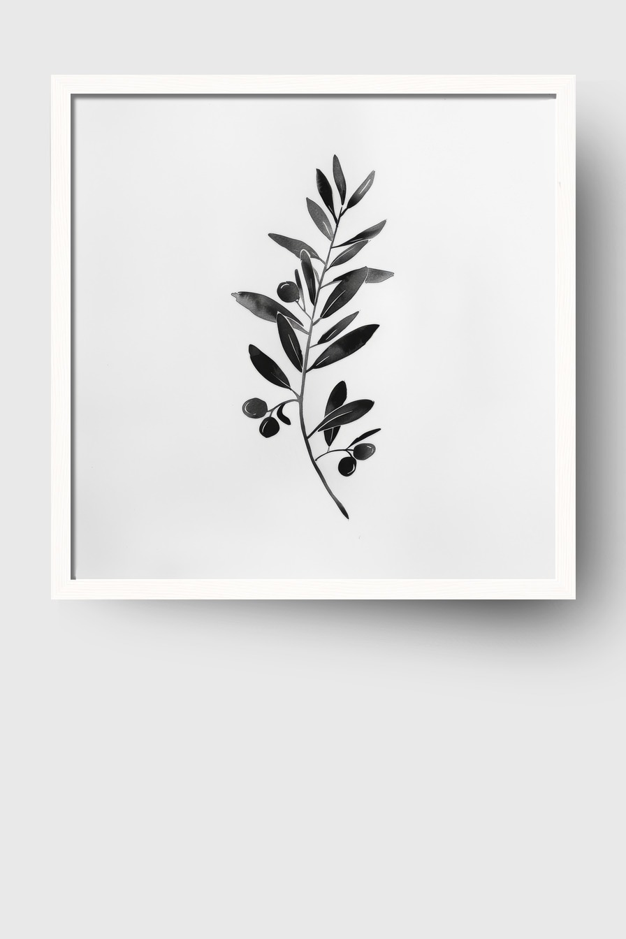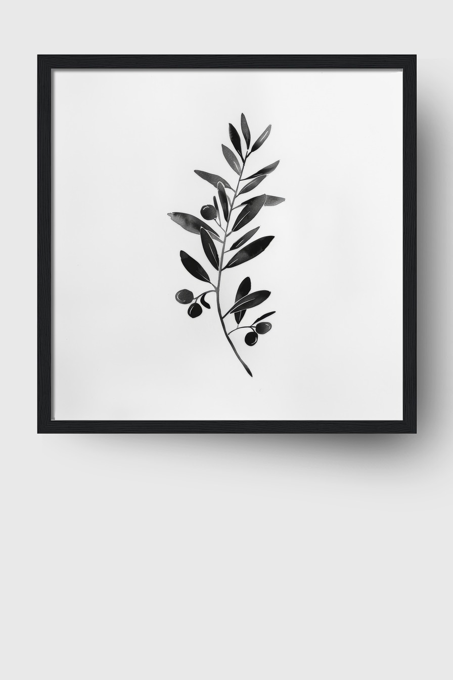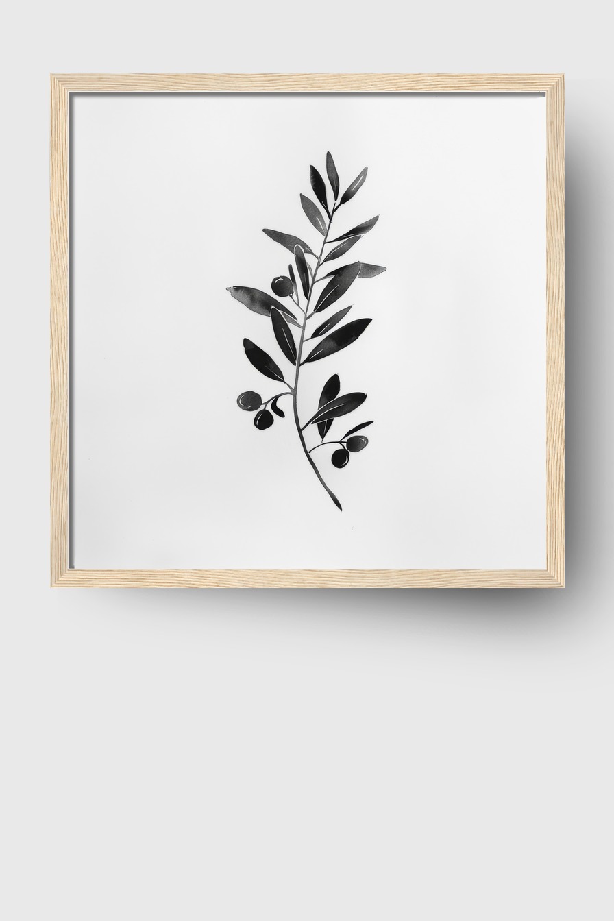Der schlichte Olivenzweig im schwarz-weißen Kontrast wirkt im Raum wie ein stiller Akzent. Die klaren Linien und die natürliche Form verleihen jeder Wand einen minimalistischen und zeitlosen Charakter. Die subtile Dynamik der angeordneten Blätter bringt Ruhe und zugleich eine gewisse Lebendigkeit.