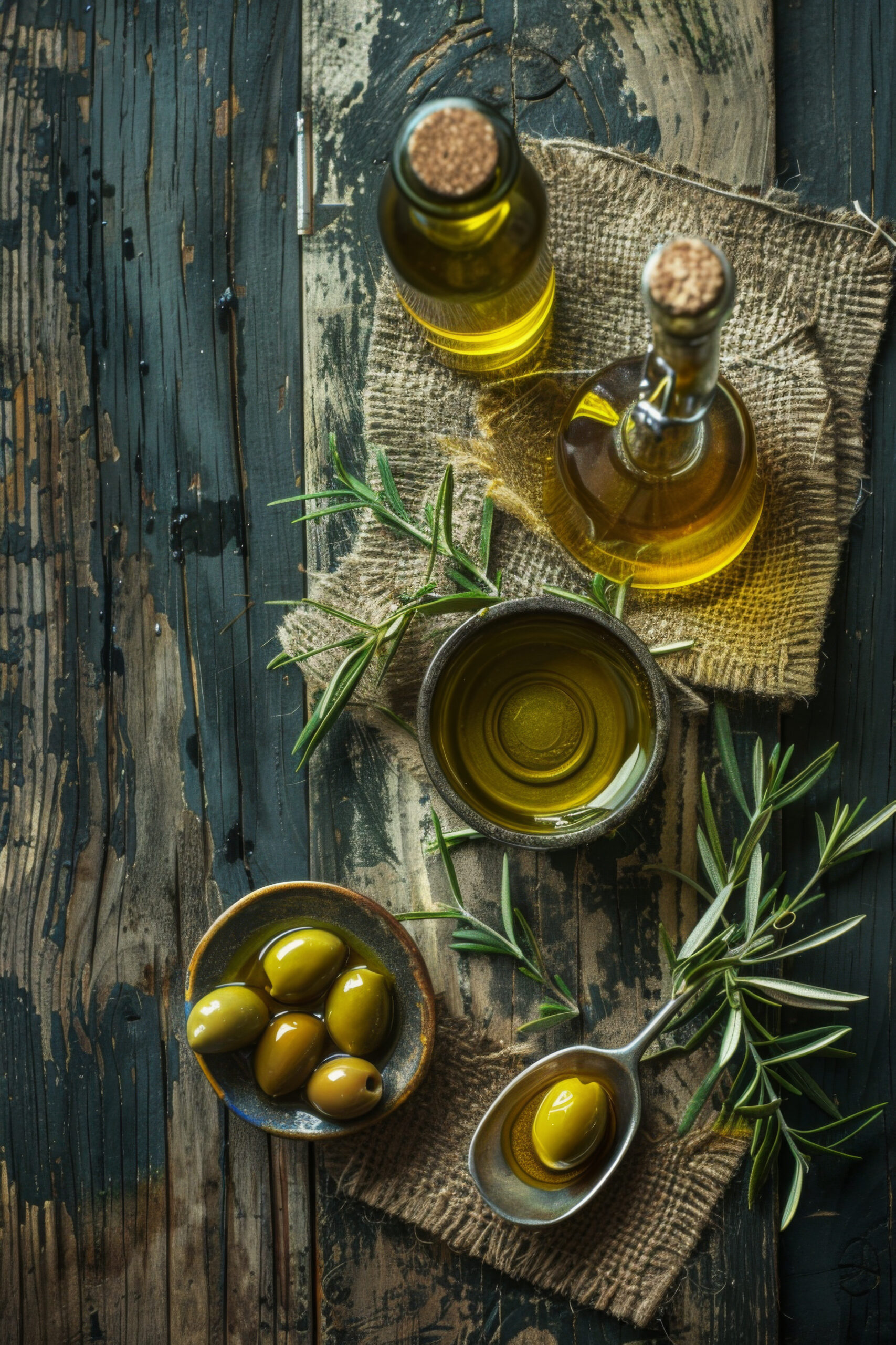 Rustikales Öl-Arrangement mit Oliven und frischen Kräutern. Alte Holzoberfläche als Hintergrund.