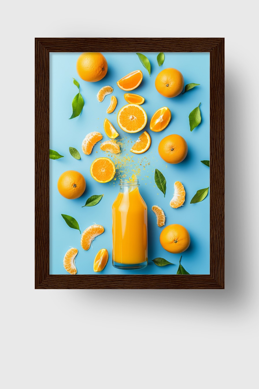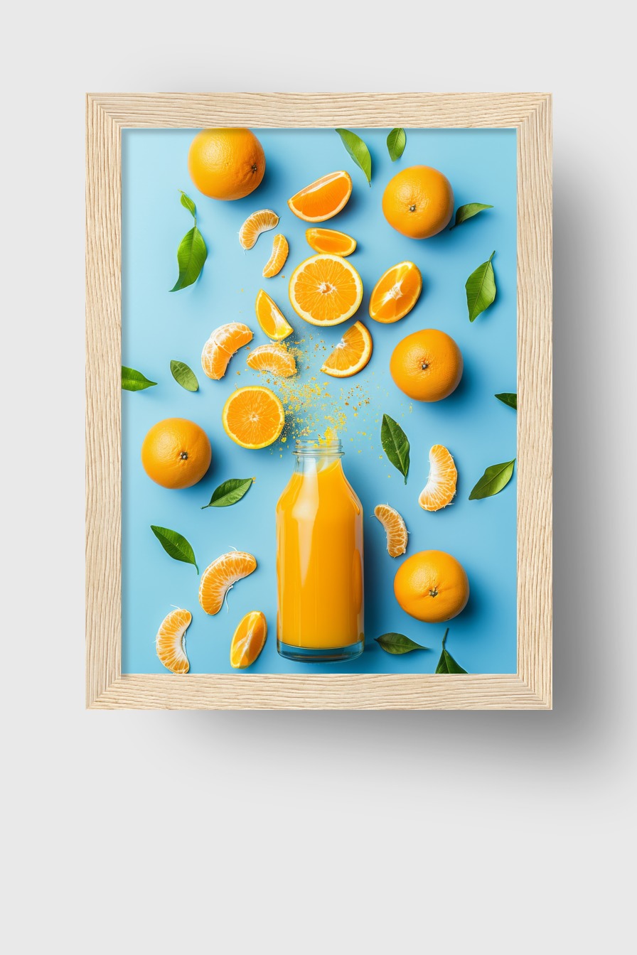 Im Raum zieht die Szenerie fruchtige Frische hinein. Die klare Flasche mit Saft wirkt als ruhiger Mittelpunkt, die aufgeschnittenen Orangen setzen lebendige Akzente, die den Raum erhellen.