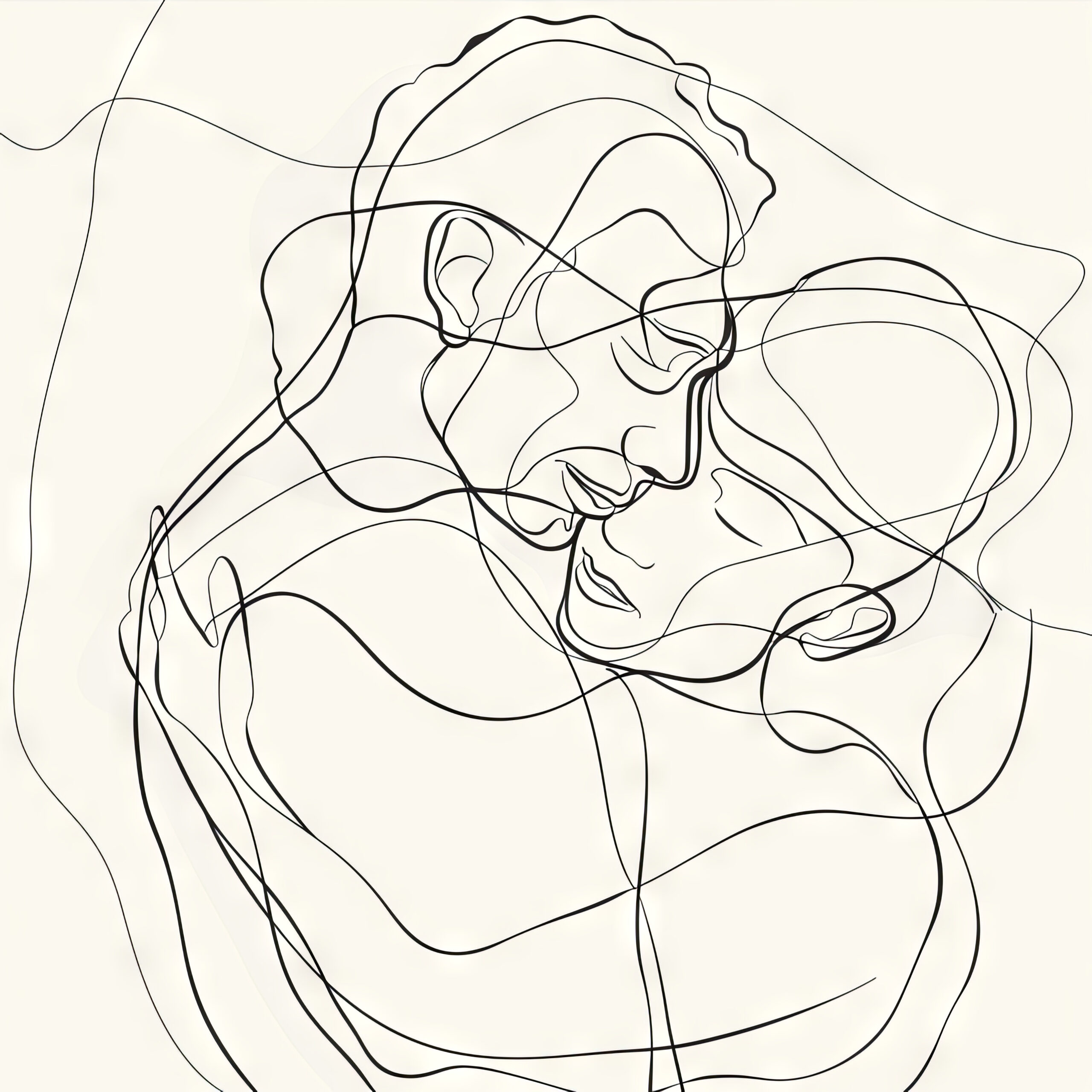 Im Raum entsteht durch die klare Linienzeichnung eine intime Atmosphäre, die den Fokus auf die sanfte Nähe eines Paares lenkt und Emotionen sichtbar macht.