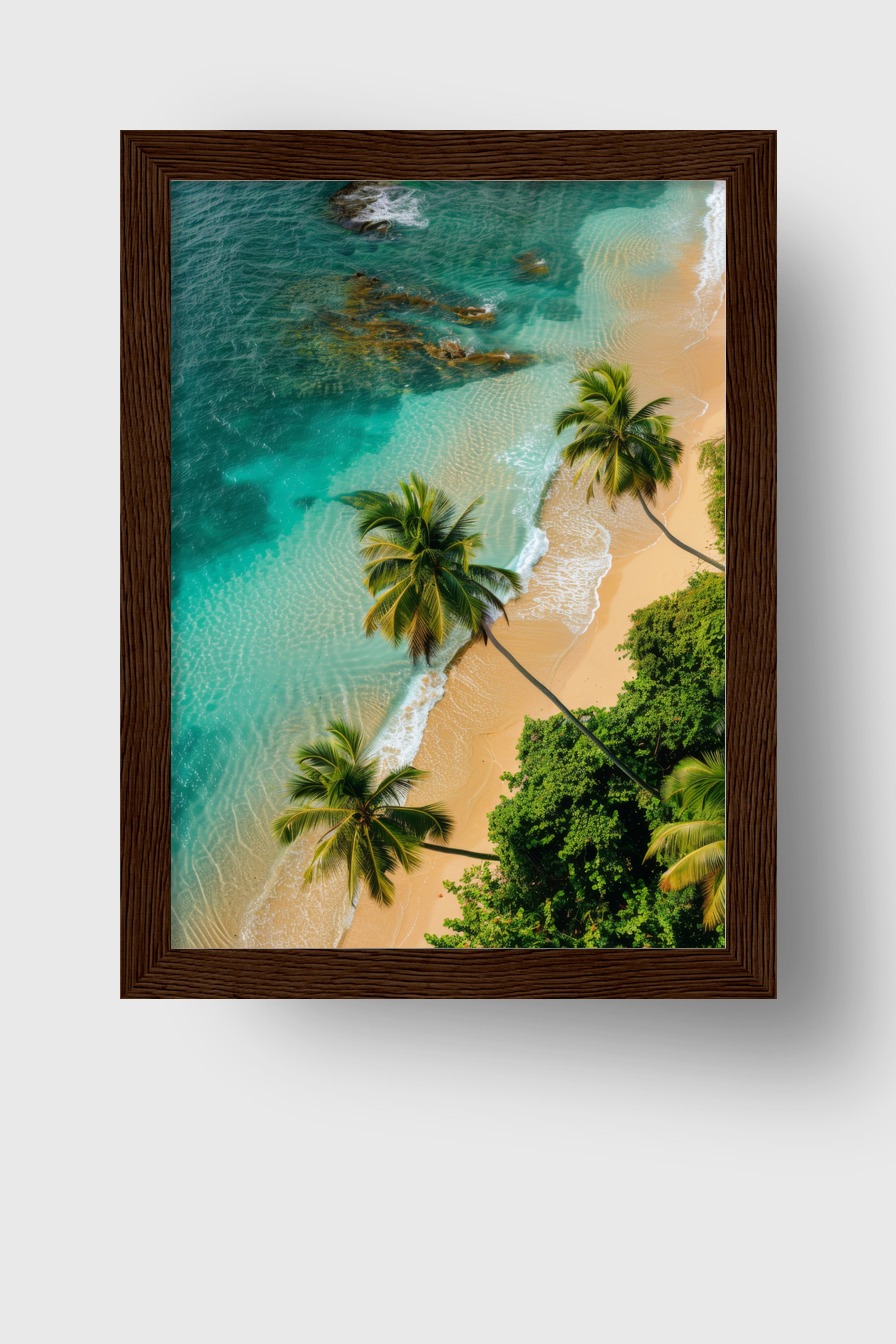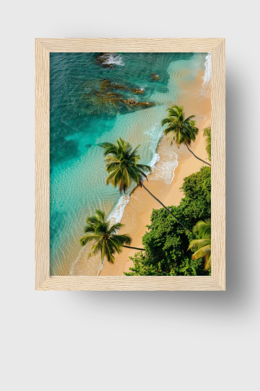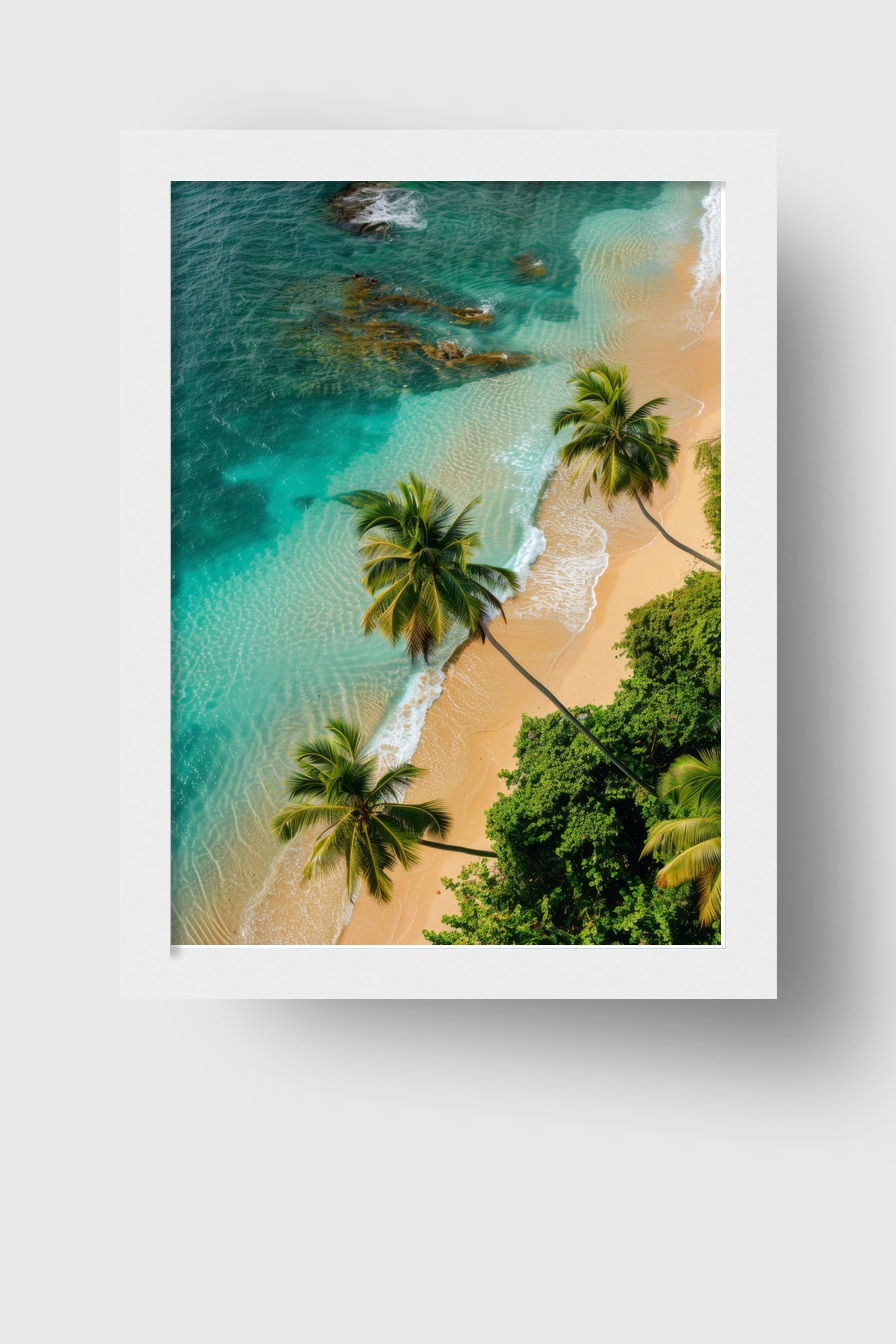 Im Raum vermittelt das Motiv eine ruhige Atmosphäre durch die harmonische Verbindung von Meer, Strand und Palmen. Die sanften Farben und natürlichen Linien ziehen Blick und Aufmerksamkeit auf sich, laden zur Entspannung ein.