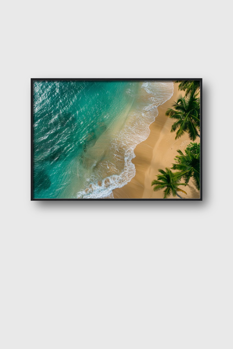 Im Raum bringt das Bild eine frische, entspannte Stimmung mit sich. Die Mischung aus lebendigem Wasser und der tropischen Vegetation wirkt einladend und weckt die Sehnsucht nach Meer und Sonne.