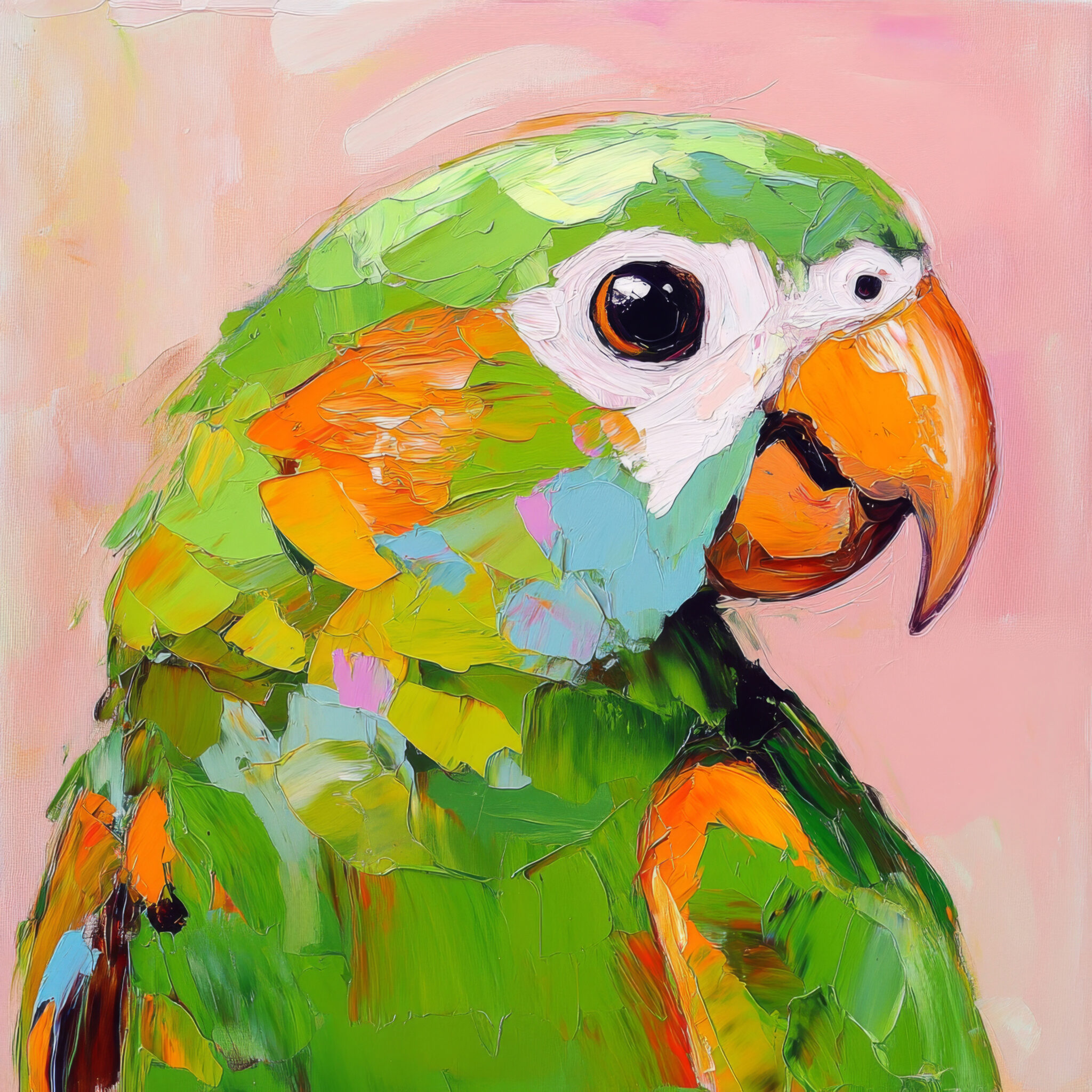 Der kräftige Orangeton des Schnabels setzt einen markanten Akzent. Die Farbflächen wirken grob und mit Energie aufgetragen. So entsteht eine lebendige Darstellung, die zugleich kantig und plastisch wirkt.