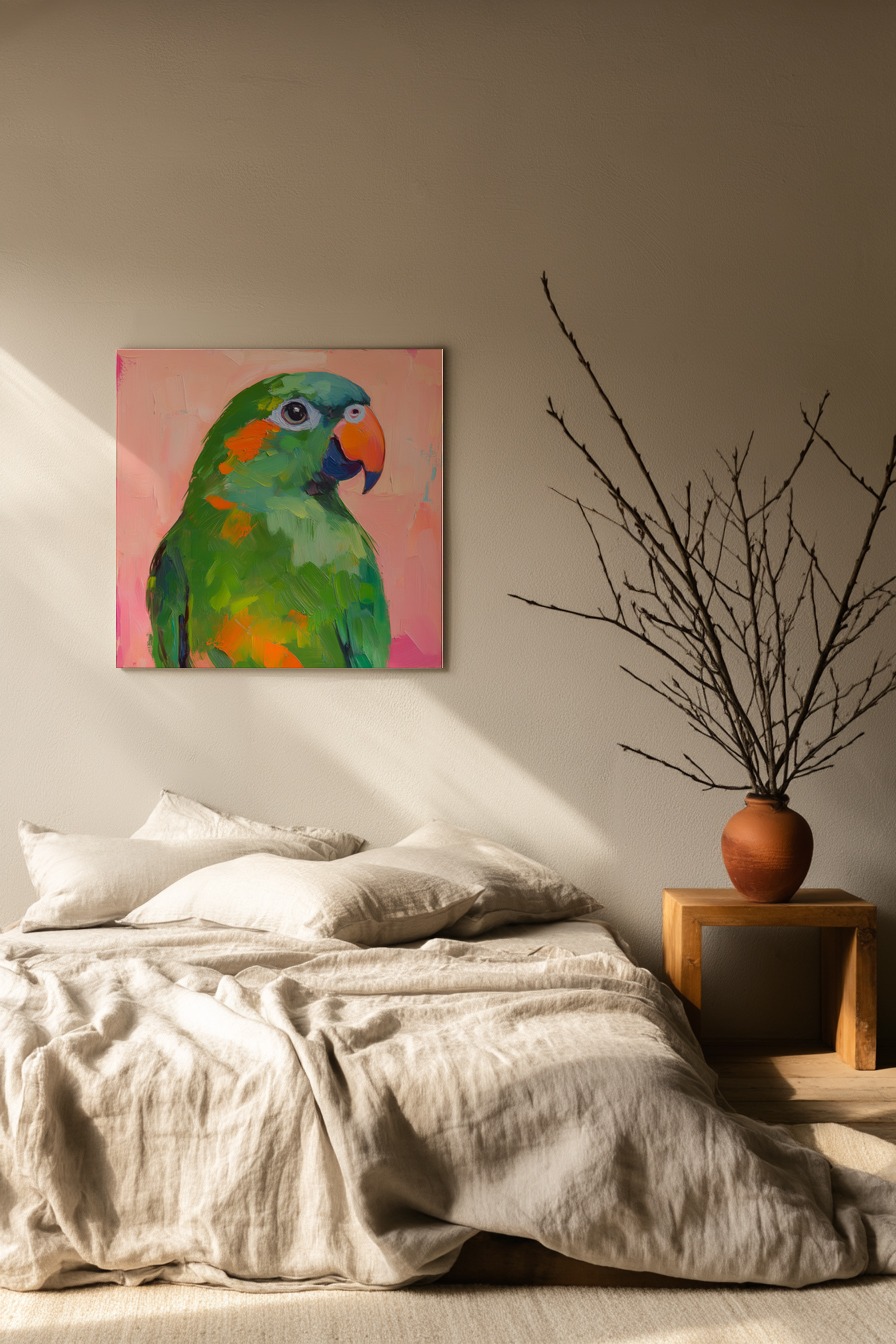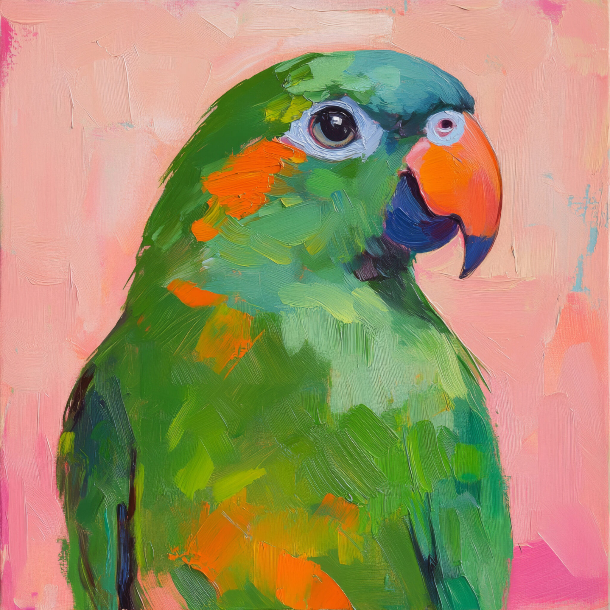 Die detailreichen Pinselstriche zeichnen lebendige grüne und orange Farbflächen auf dem Gefieder, die Schnabelform kontrastiert scharf zum sanften rosafarbenen Hintergrund ohne klare Konturen, ein intensiver Blick mit hellem Auge.