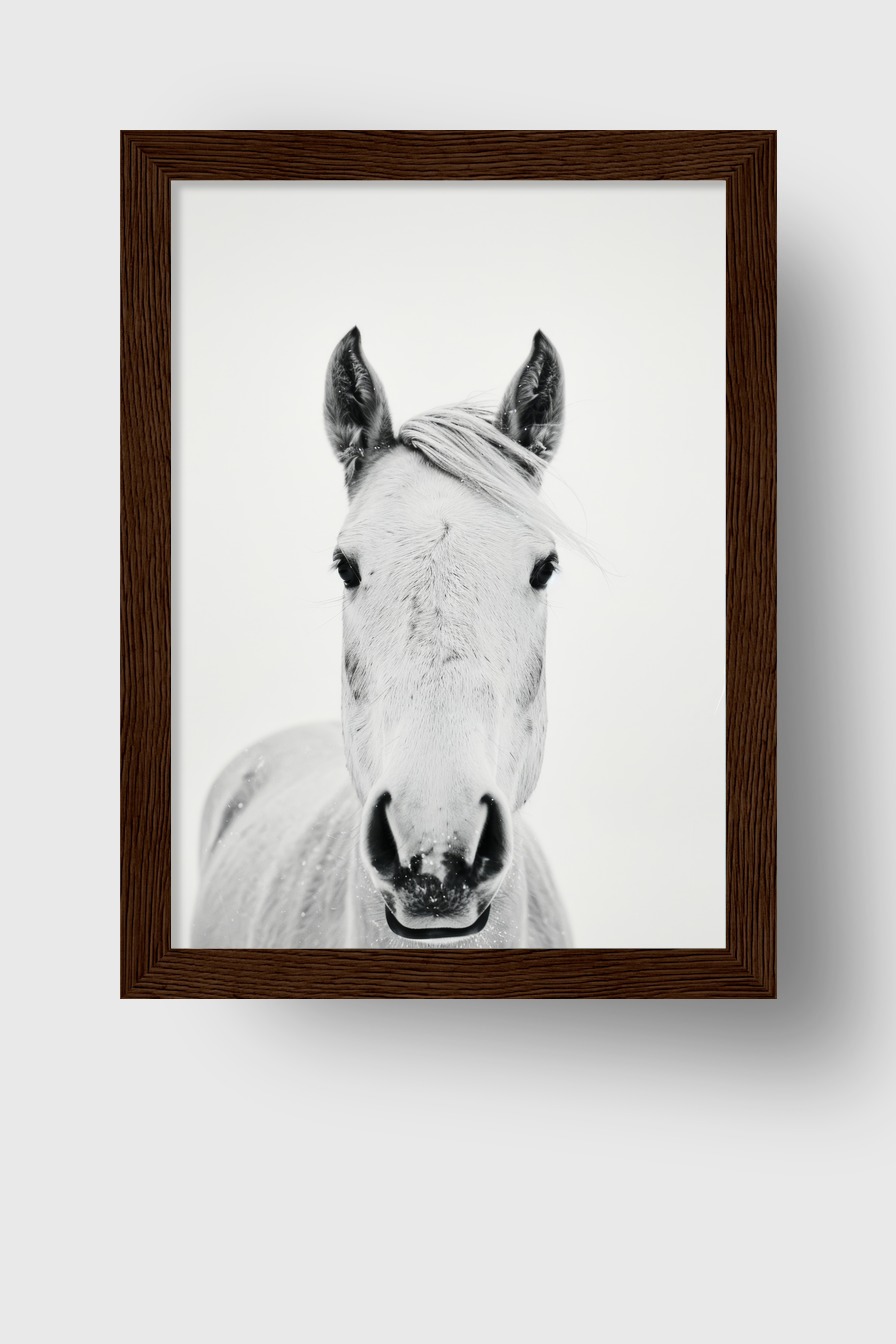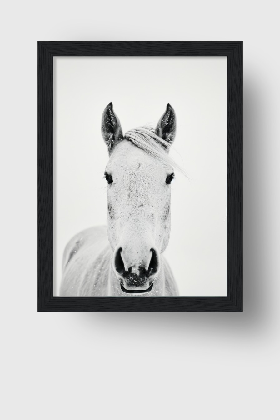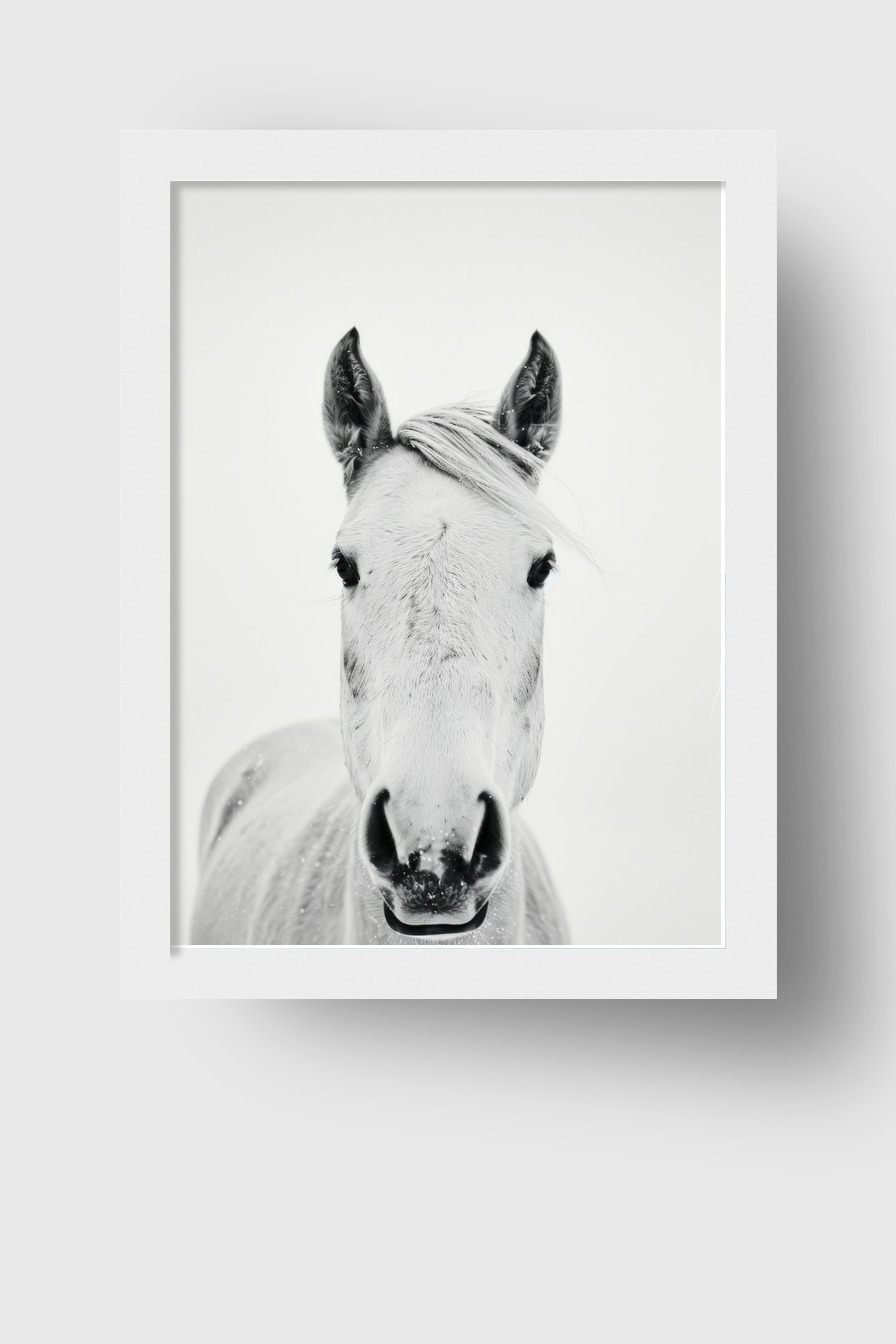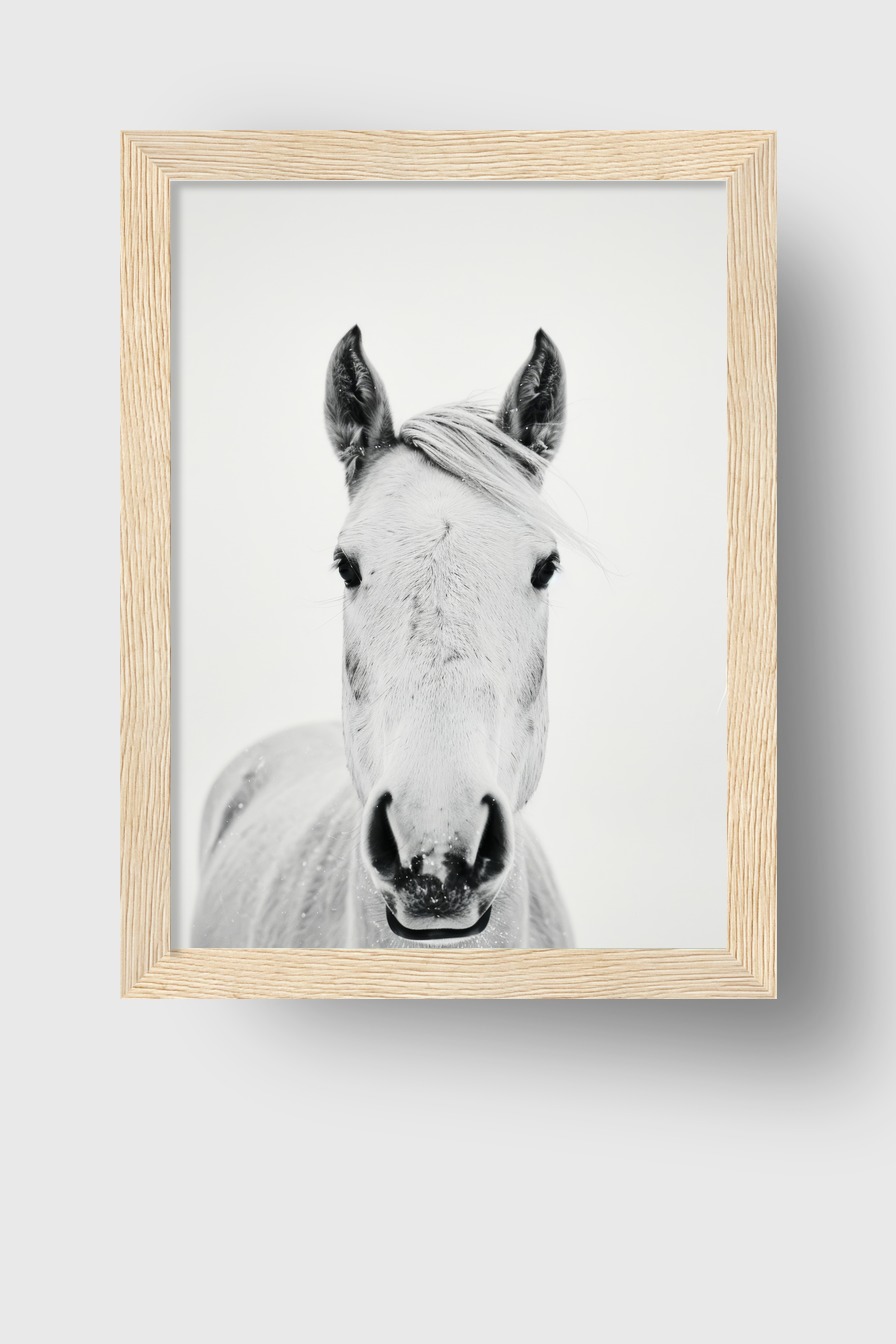 Im Raum wirkt das Motiv ruhig und reduziert. Das klare Schwarz-Weiß verstärkt die Präsenz des Pferdes.