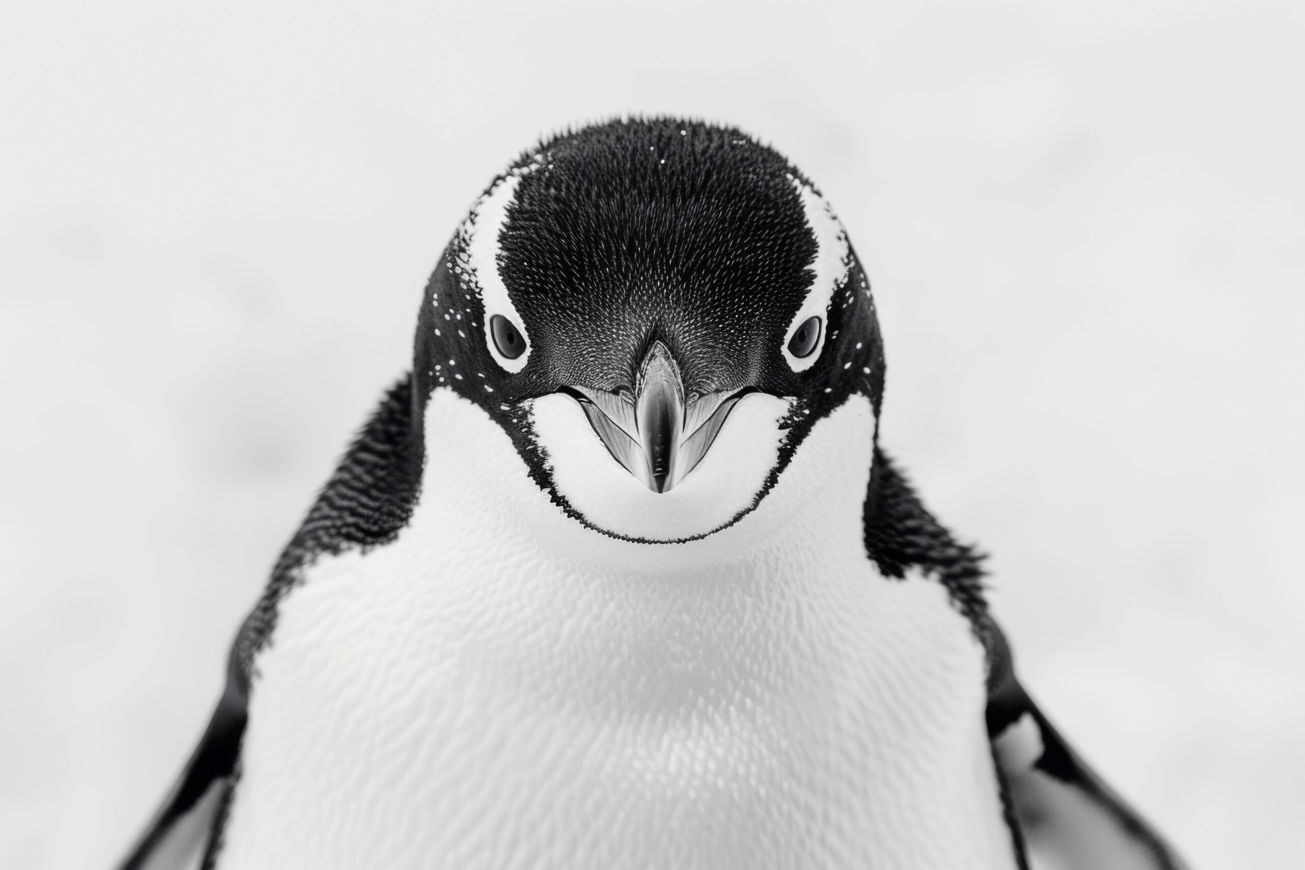 Das Bild erzeugt eine starke, direkte Wirkung durch die konzentrierte Frontansicht. Die klare Linienführung und das monochrome Farbschema wirken zusammen sehr reduziert und fokussieren voll auf den Pinguin.