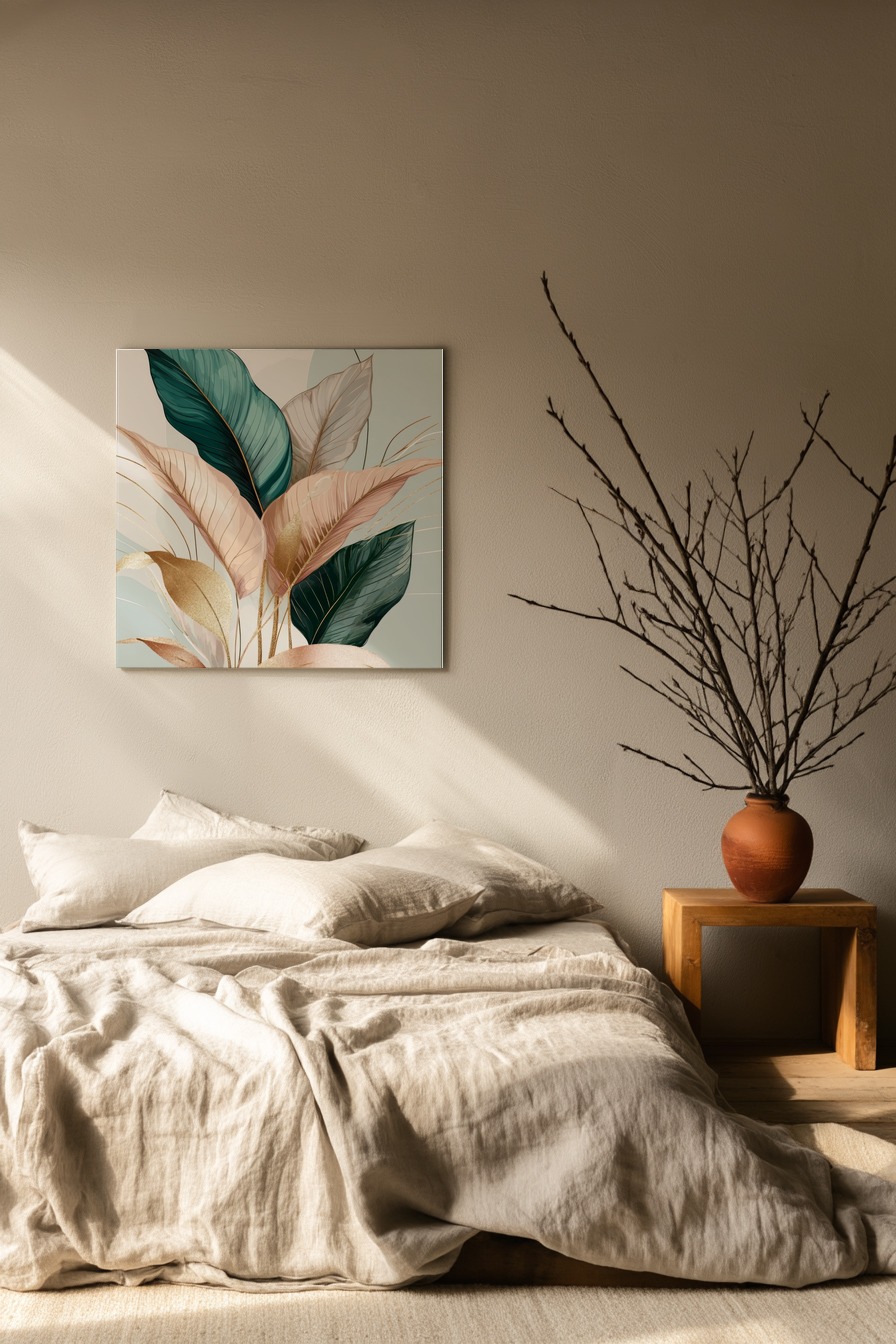 Ein Arrangement von Blättern in verschiedenen Grüntönen und zarten Beige- und Goldakzenten. Gedruckt auf halbmattem Papier (170 g/m², FSC-zertifiziert) zeigt das Papier die feinen Details gut und hat einen leichten Glanz. Wird ungerahmt geliefert – zum selbst Einrahmen oder solo an der Wand.