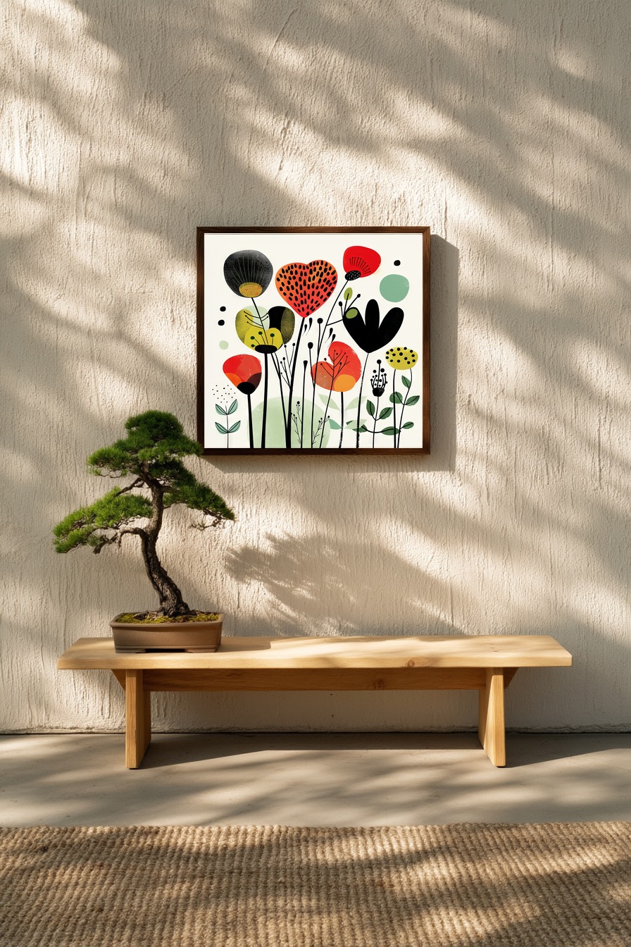 Feine Linien formen zarte Stängel und Samenkapseln, während farbige, abstrakte Blütenflächen in Rot, Gelb und Grün die Komposition lebendig strukturieren und durch schwarze Details Kontraste setzen.