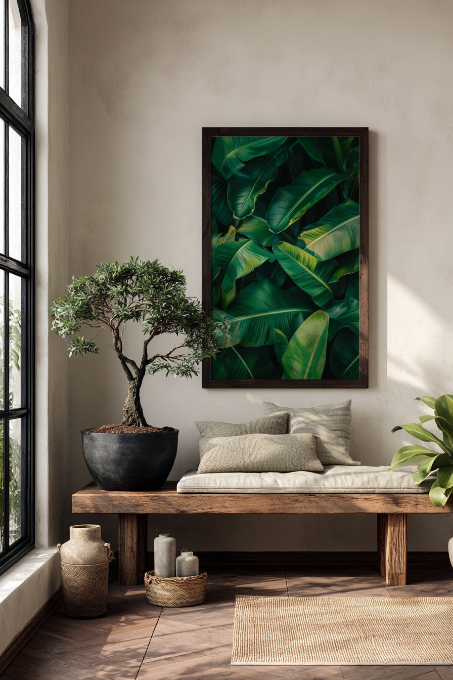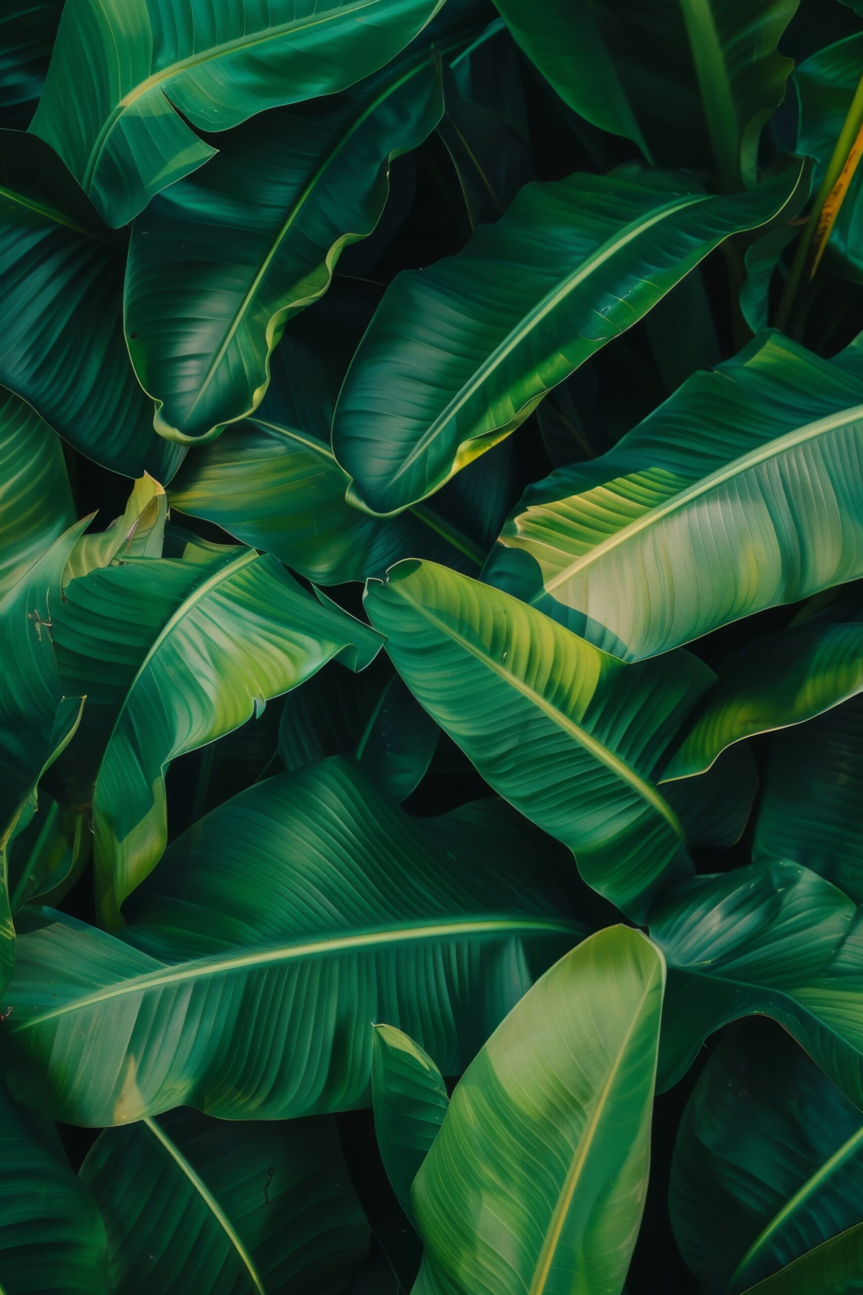 Das dichte Blattwerk zeigt klare Konturen und markante Blattadern. Die satten Grüntöne und Lichtreflexe fangen den tropischen Charakter scharf ein.