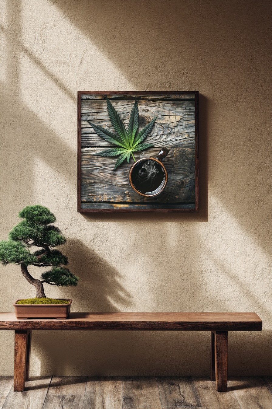 Das grüne Hanfblatt hebt sich scharf vom rustikalen Holzuntergrund ab, die Kaffeetasse daneben schwarz glänzend mit zarten Dampfkringeln darüber, hölzerne Maserungen kontrastreich und lebendig.