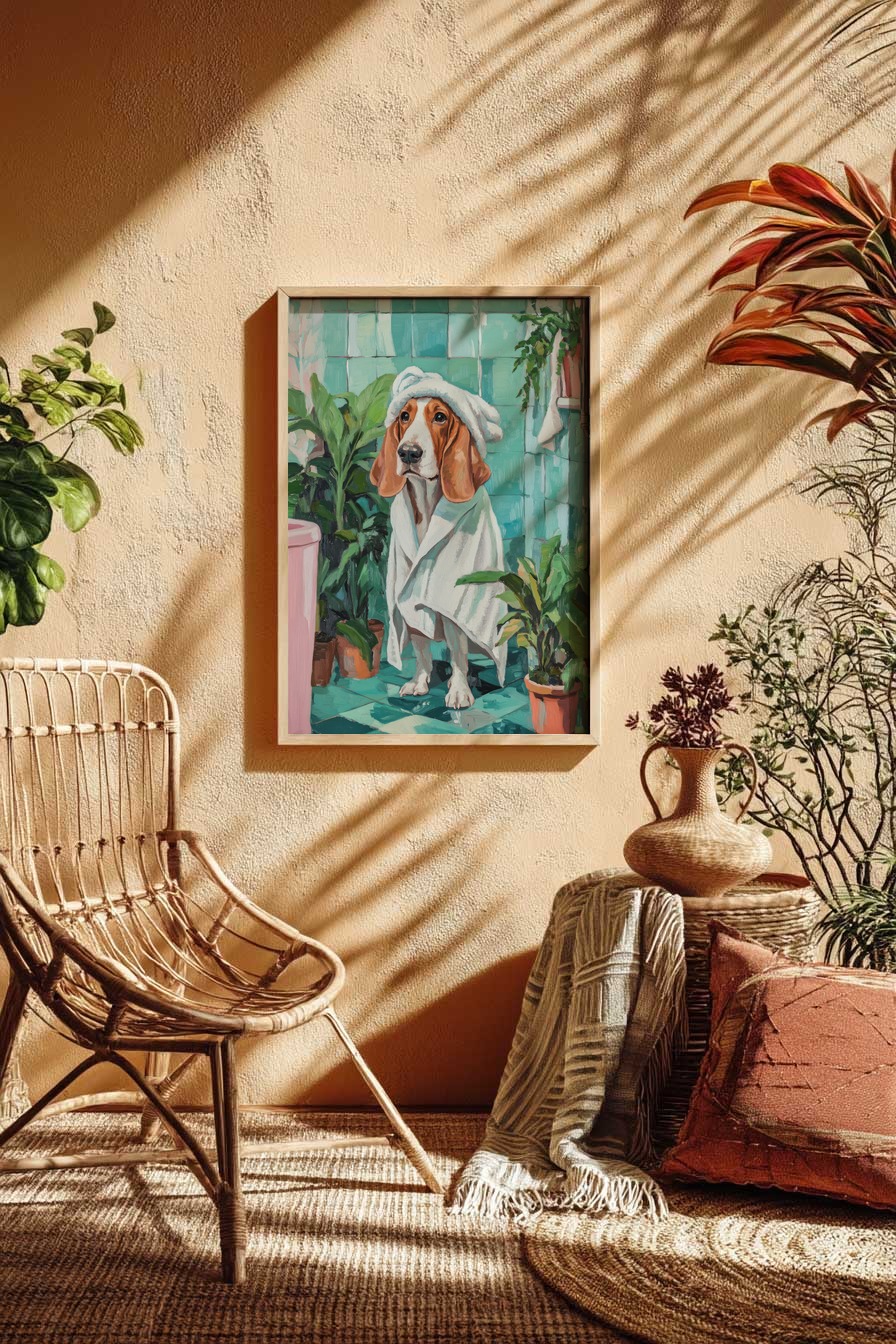 Ein Hund sitzt mit einem Handtuch und Turban auf dem Kopf in einem Badezimmer. Die Szenerie ist von grünen Fliesen und Pflanzen umgeben.