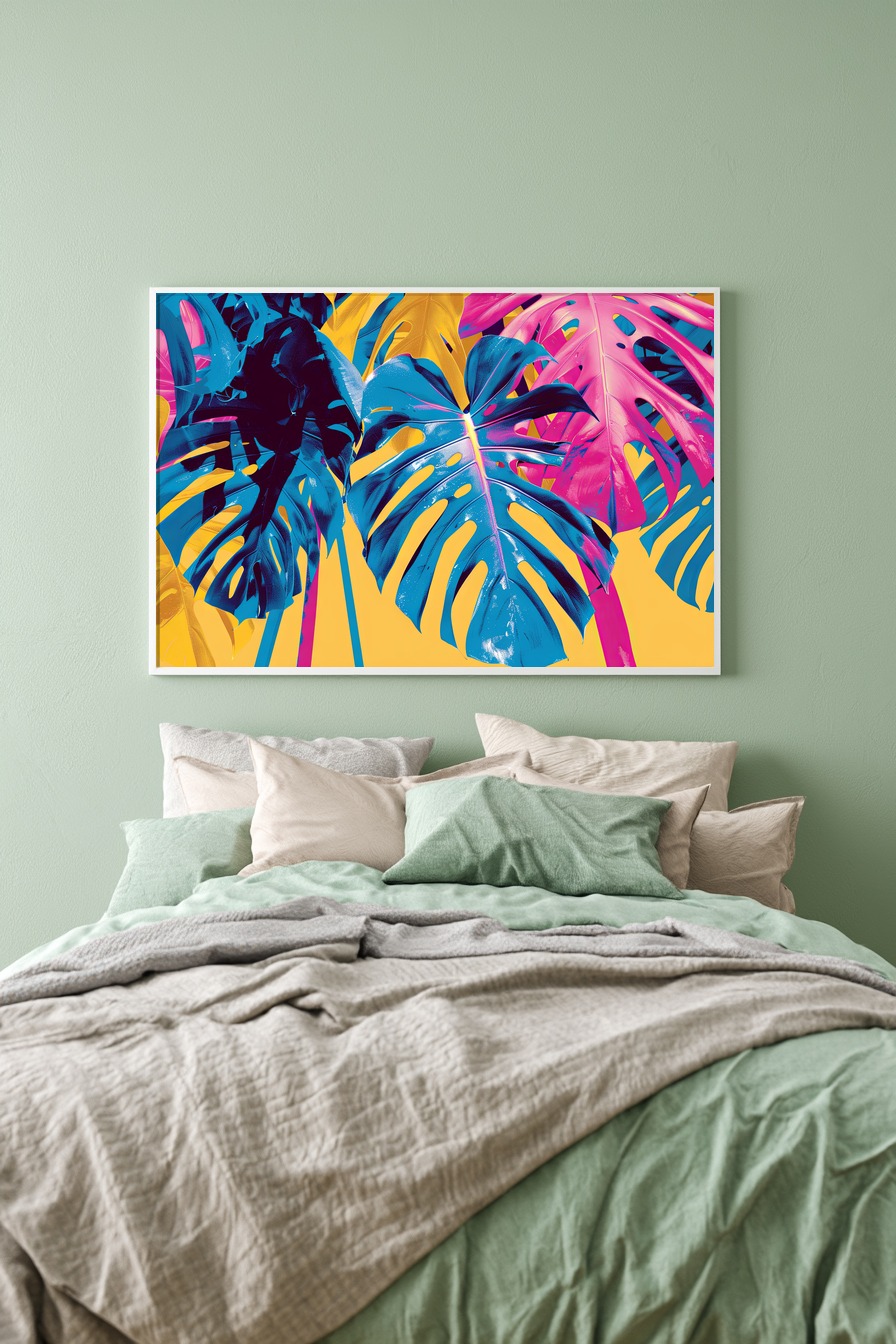 Fallende Monstera-Blätter in leuchtenden Farben. Gedruckt auf 170 g/m² FSC-Papier ohne Glanz. Passt gut in farbige Räume.
