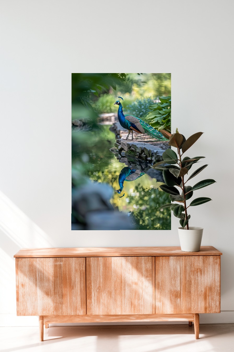 Pfau steht auf dem Steg am Wasser. Das Gefieder und der Kopf sind klar sichtbar mit reflektierender Spiegelung im Teich.