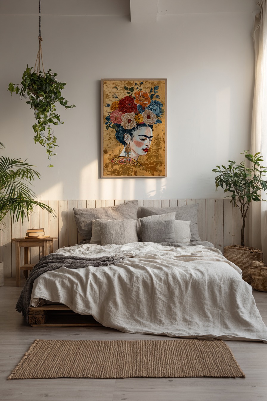 Starkes Porträt einer Frau mit Blumenkranz im Haar. Gedruckt auf halbmattem 170 g/m² FSC-Papier mit matter Oberfläche. Wird ungerahmt geliefert, zum selbst Einrahmen oder solo geeignet.