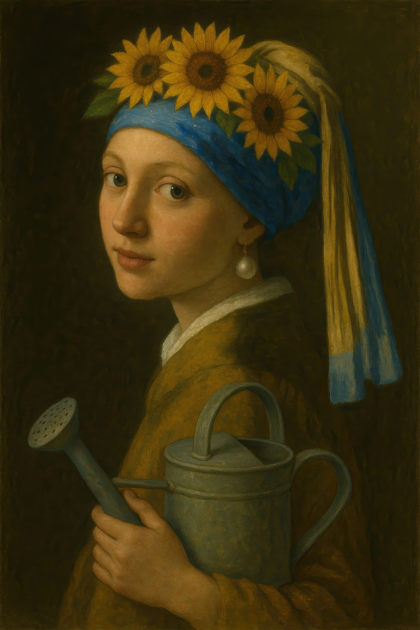 Malerei Poster Mädchen Porträt Sonnenblumen Gießkanne blau