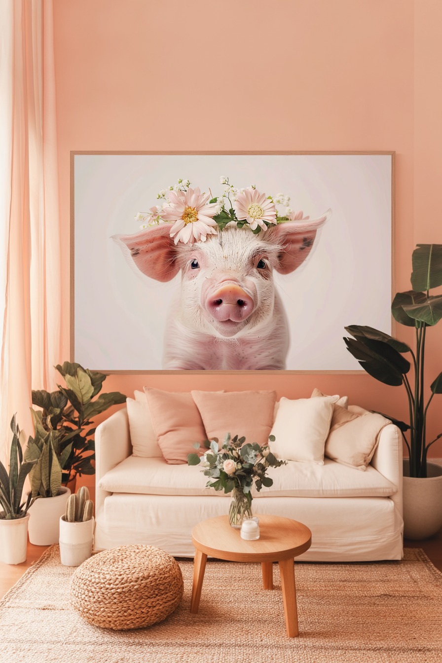 Das Schwein steht nah am Bildrand, der zarte Blumenkranz betont die weiche Textur des Fells. Im Blick spiegelt sich eine ruhige Neugier, die Blüten färben die zarten Rosatöne zusätzlich ein. Sanfte Schatten lassen Details im Fell sichtbar werden und erzeugen Tiefe im Bild.