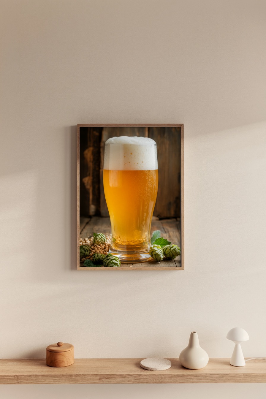Ein frisch eingeschenktes Bierglas mit dichtem Schaum steht auf einem Holztisch. Rundherum liegen Hopfenzapfen und Gerstenkörner, die Zutaten des Biers.