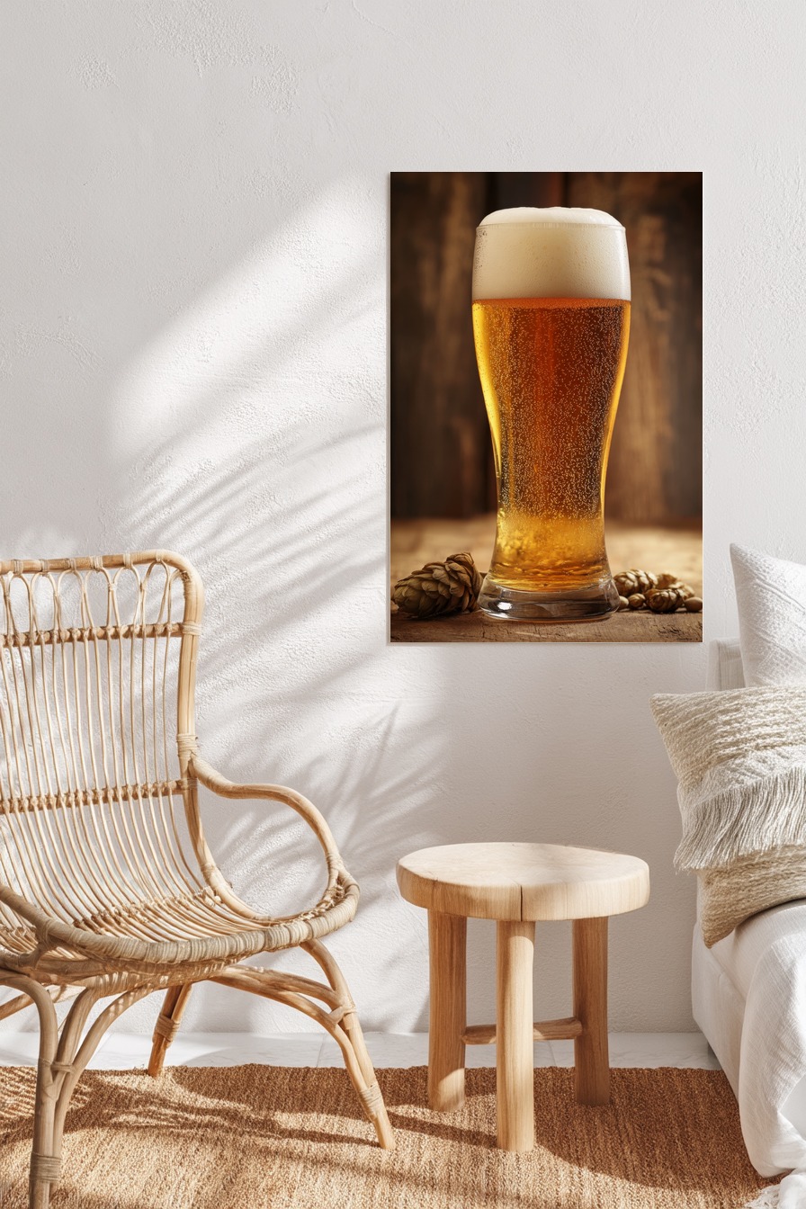 Ein Glas Bier mit dichter Schaumkrone steht auf Holz. Gedruckt auf halbmattem Papier (170 g/m², FSC-zertifiziert). Die halbglänzende Oberfläche bringt die goldenen Farbnuancen besonders zur Geltung. Wird ungerahmt geliefert – zum selbst Einrahmen oder solo.