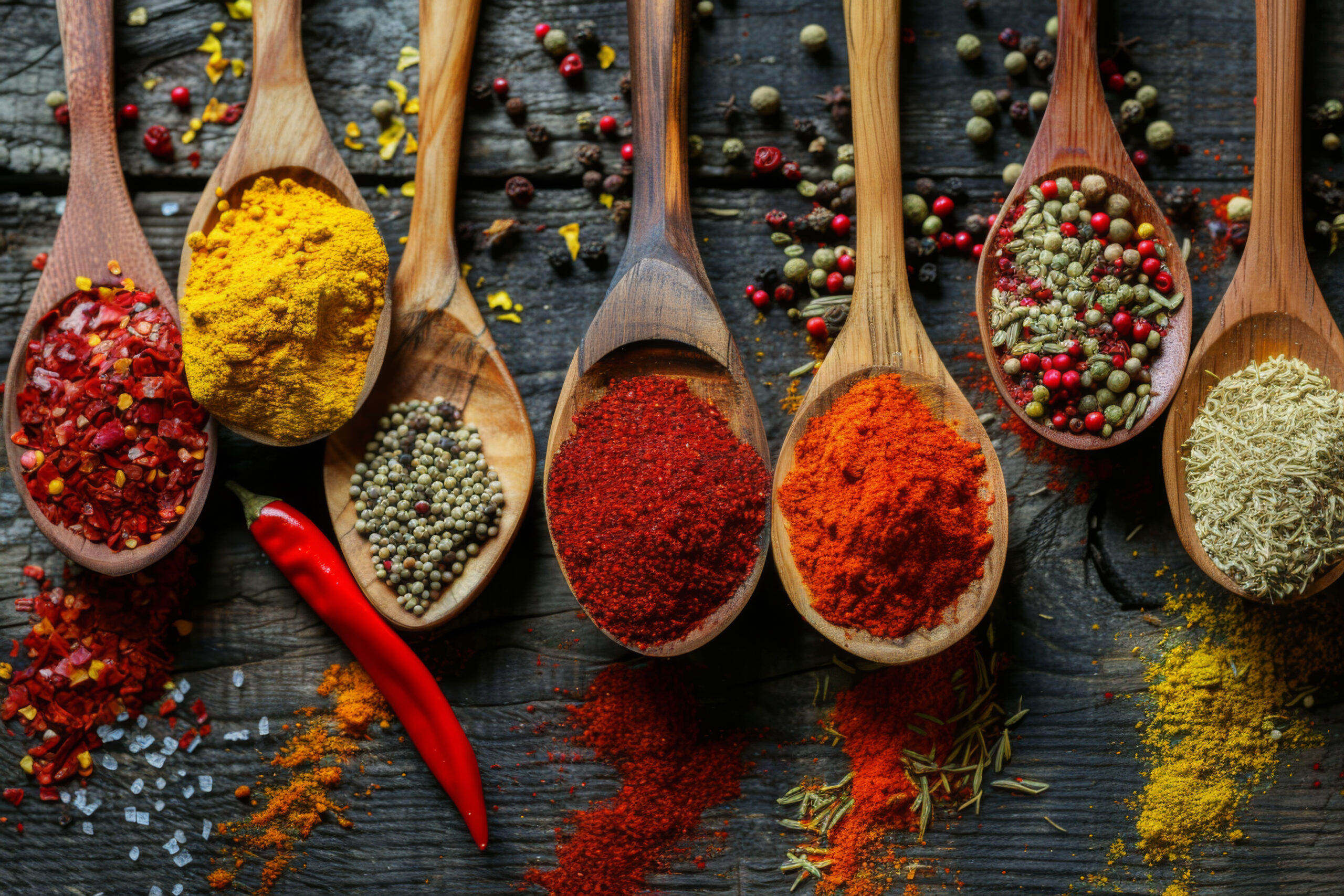 Holzlöffel mit sieben verschiedenen Gewürzen. Farben variieren von Gelb bis Rot. Anordnung nebeneinander auf dunklem Untergrund.
