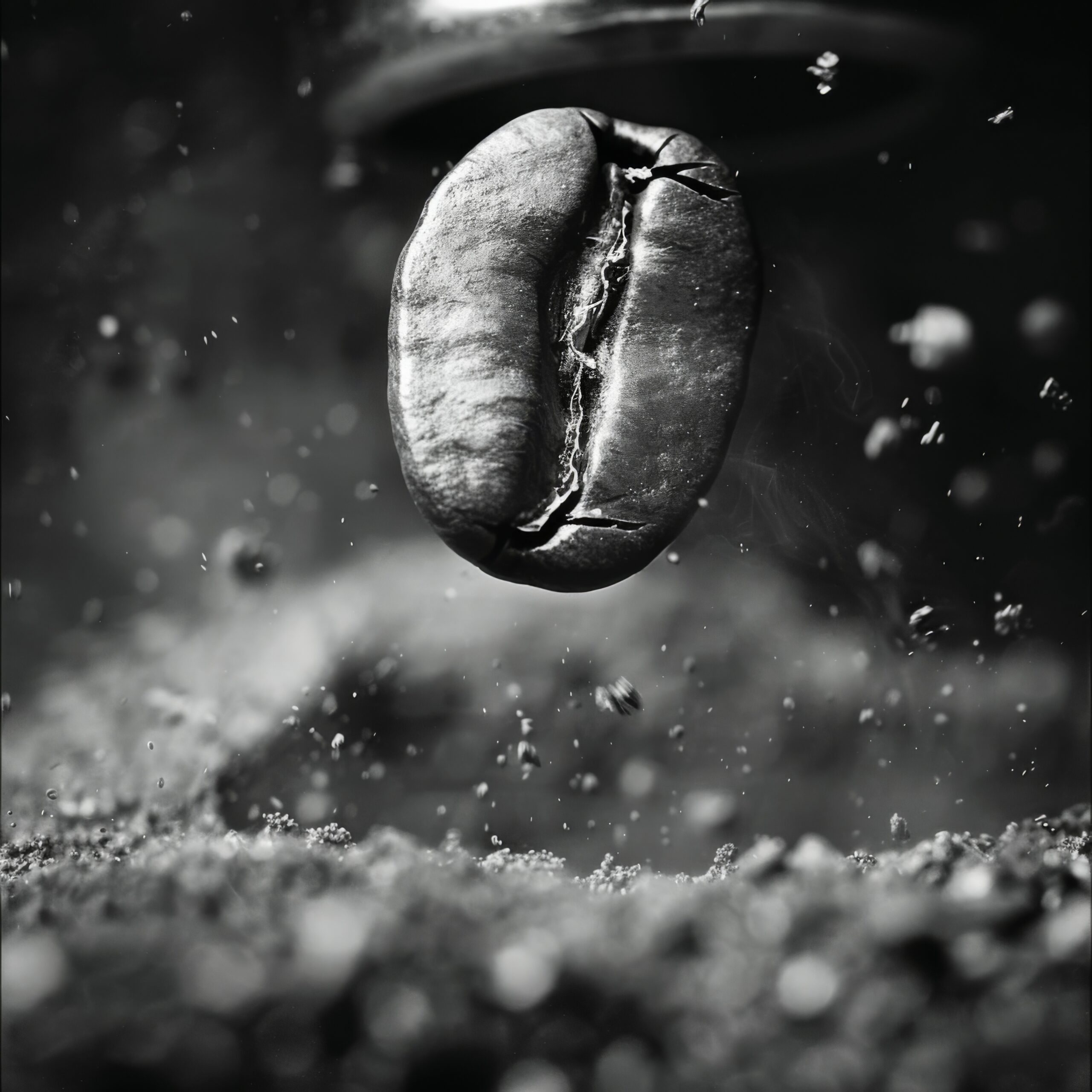 Nahaufnahme einer einzelnen Kaffeebohne in Schwarz-Weiß mit Fokus auf texturierte Oberfläche und Risse