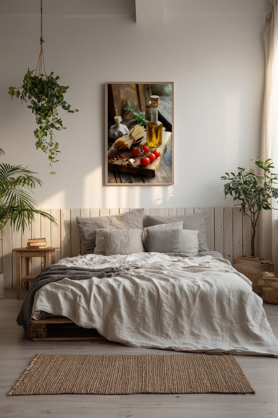 Das helle Glänzen der Olivenölflasche im Fokus, knorriges Holz und frische Tomaten schaffen eine ruhige Komposition. Kleine Akzente von Gewürzen verteilen sich unaufdringlich, die Pasta gebündelt in natürlicher Farbigkeit. Lichtspiele fangen Details ein und unterstützen die häusliche Atmosphäre.