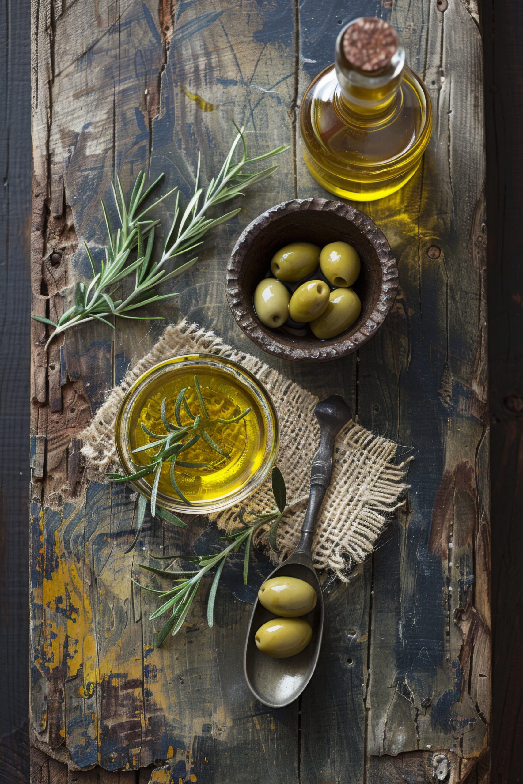 Das Ölgemisch wirkt durch seine goldene Transparenz lebendig, während die grünen Oliven und Rosmarinzweige im natürlichen Licht betont werden.