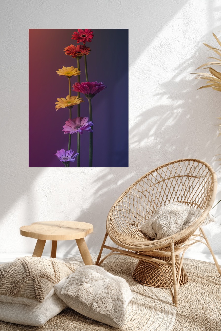 Ein Strauß bunter Gerbera auf dunkelviolettem Hintergrund. Gedruckt auf halbmattem Papier (170 g/m², FSC-zertifiziert) mit dezentem Glanz. Wird ungerahmt geliefert – ideal zum selbst Einrahmen.