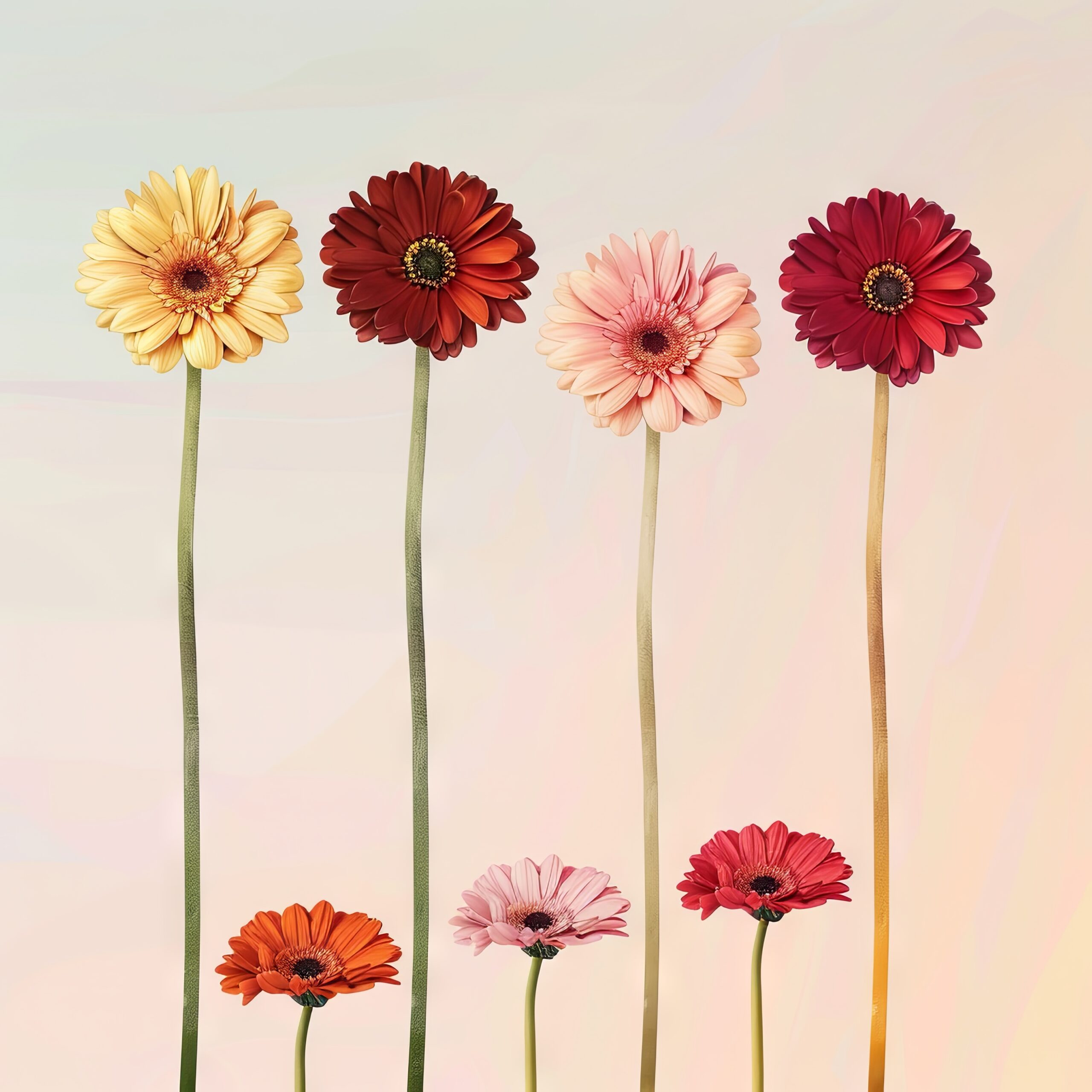 Sieben Gerbera in sanften Farben auf hellem Hintergrund. Gedruckt auf halbmattem Papier (170 g/m², FSC-zertifiziert). Die leicht glänzende Oberfläche hebt die Farbnuancen hervor. Wird ungerahmt geliefert zum Einrahmen oder Solo.