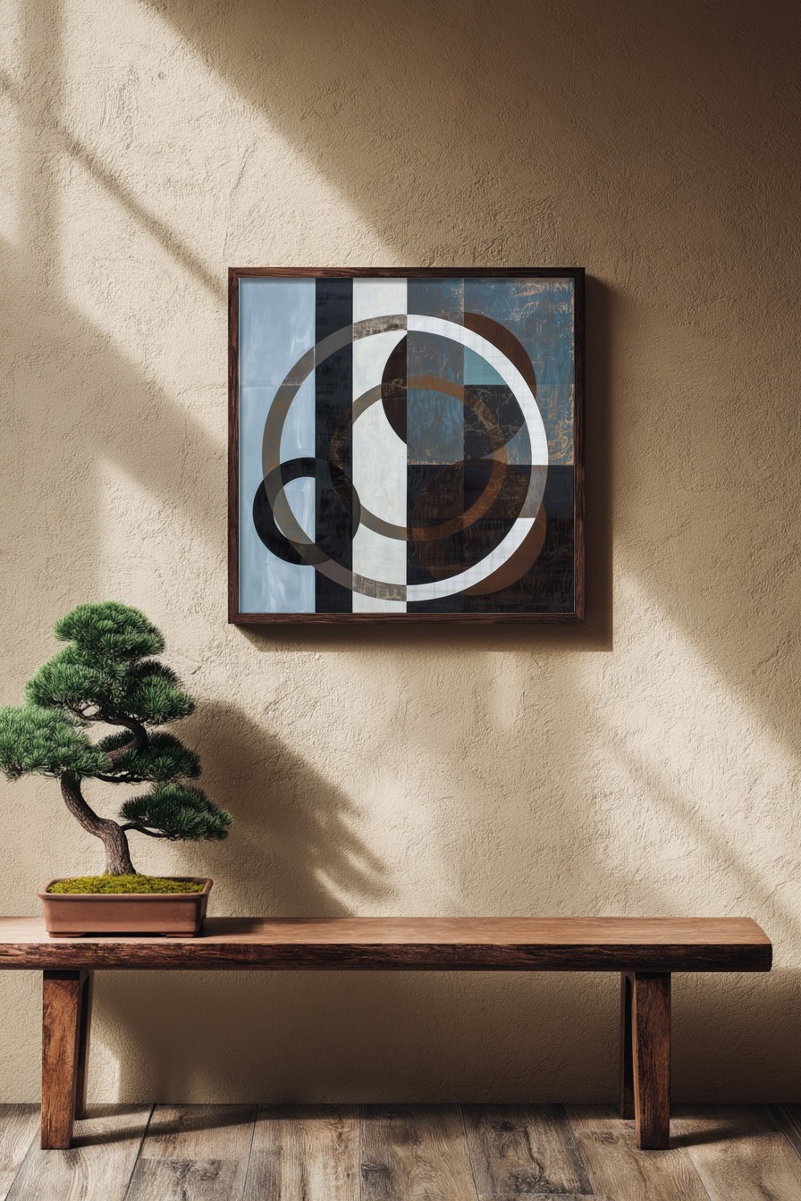 Mehrere Ringe überlagern ein Muster aus quadratischen Feldern in verschiedenen dunklen und hellen Tönen.