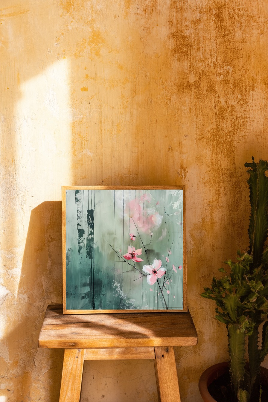 Die feinen rosa Blütenblätter offenbaren fragile Härte. Dünne schwarze Zweige schneiden scharf durch den diffusen grünen Hintergrund. Ein Motiv, das mit spitzer Klarheit und sanfter Farbigkeit spielt.