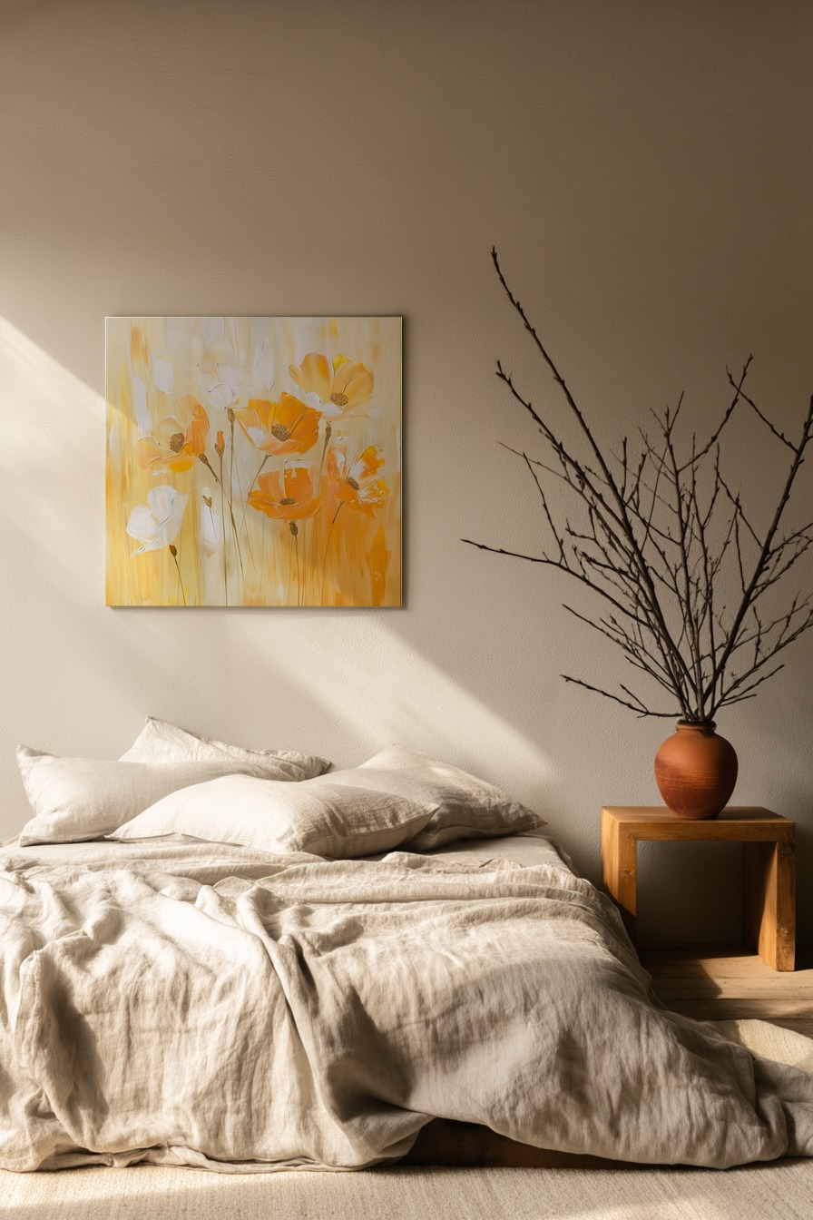 Die dicken Farbschichten der Blütenblätter sind eine einprägsame Spur des Malers und verleihen dem Bild eine lebendige Textur in warmen Orangetönen.