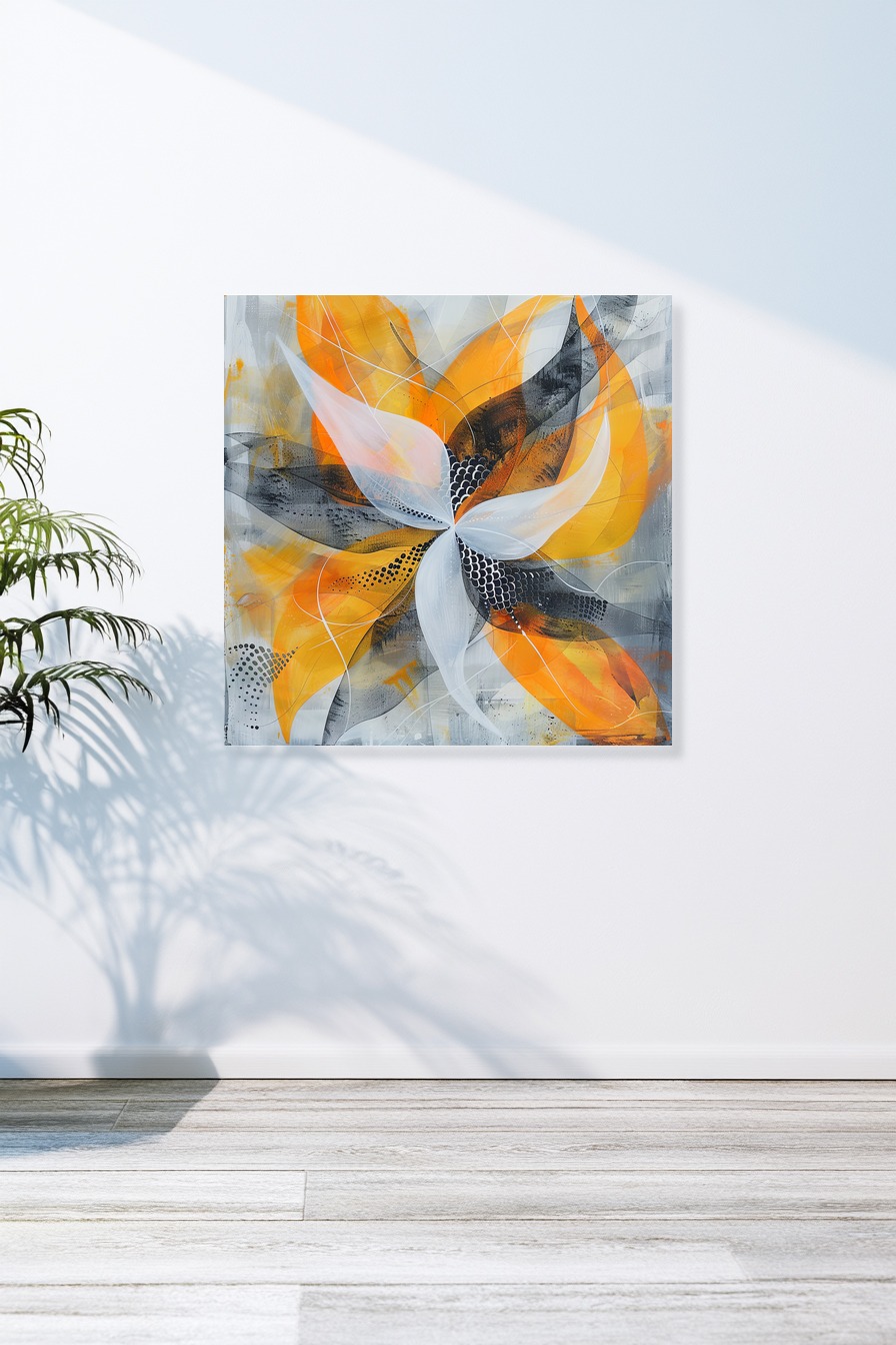 Abstrakter Kunstdruck einer stilisierten Blume mit orangen, weißen und schwarzen Blütenblättern als modernes Poster