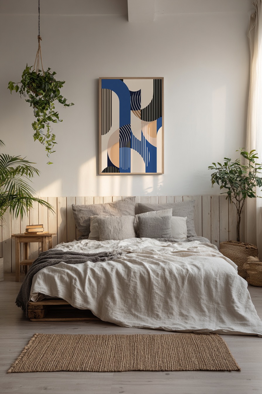 Das Motiv zeigt abstrakte Bögen und Linien in harmonischer Farbkomposition. Es wirkt modern und geometrisch klar.
