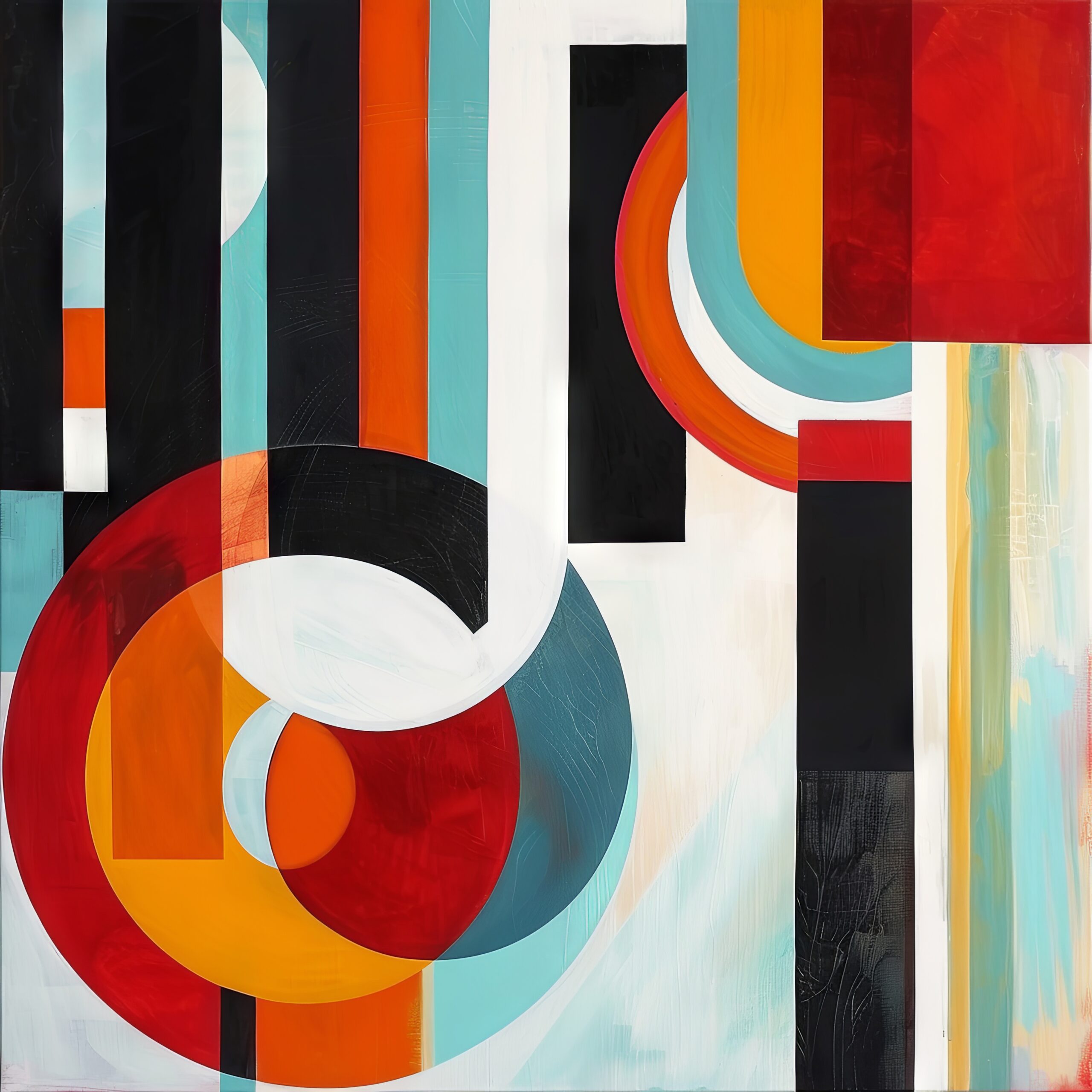 Die farbigen Kreise und vertikalen Linien scheinen in einem harmonischen Dialog zu stehen. Farbflächen überlagern sich transparent und schaffen so eine subtile Tiefe. Die Kombination aus Orange, Rot und Türkis setzt lebendige Akzente in einem ausgewogenen Kompositionsgefüge.