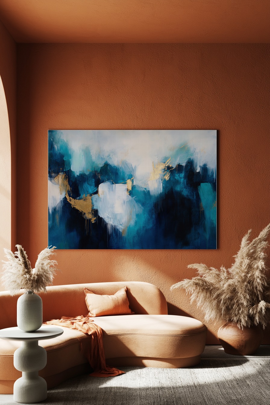 Abstraktes Poster mit blau-weißen Farbflächen und goldenen Akzenten, moderner Kunstdruck mit strukturierter Farbgestaltung