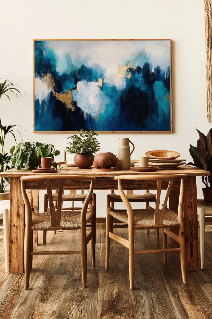 Diese abstrakte Komposition zeigt intensive blaue und weiße Farbflächen mit goldenen Details. Die fließenden Formen erzeugen eine lebendige und edle Wirkung.