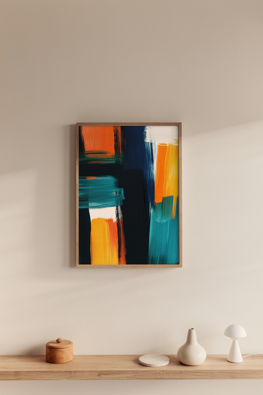 Abstrakter Kunstdruck mit kräftigen Farbblöcken in Orange, Blau und Türkis als Poster auf halbmattem Papier