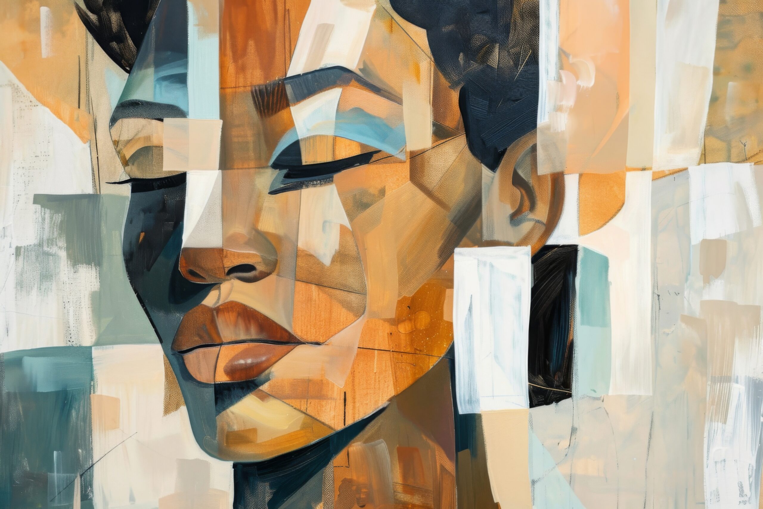 Die Farbflächen auf den Lippen verleihen dem Bild Markanz. Das farbige Spiel stammt von deutlichen Konturen und einer kubistischen Herangehensweise.